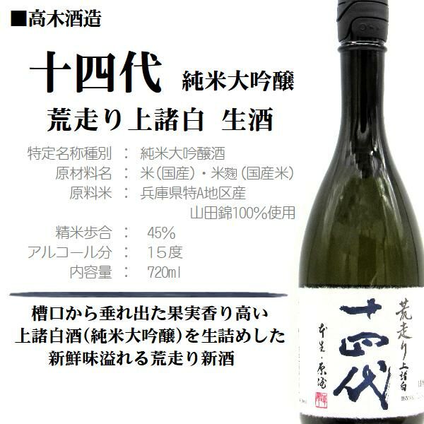 高木酒造最新酒款。每年冬季都是十四代生酒出荷的季節,過往生酒出品都是以55%/50%及最高階的極上諸白35%釀造。今年第一次以上諸白45%釀製,並以荒走方式出荷,可品嘗最新鮮及高端的十四代作品。
