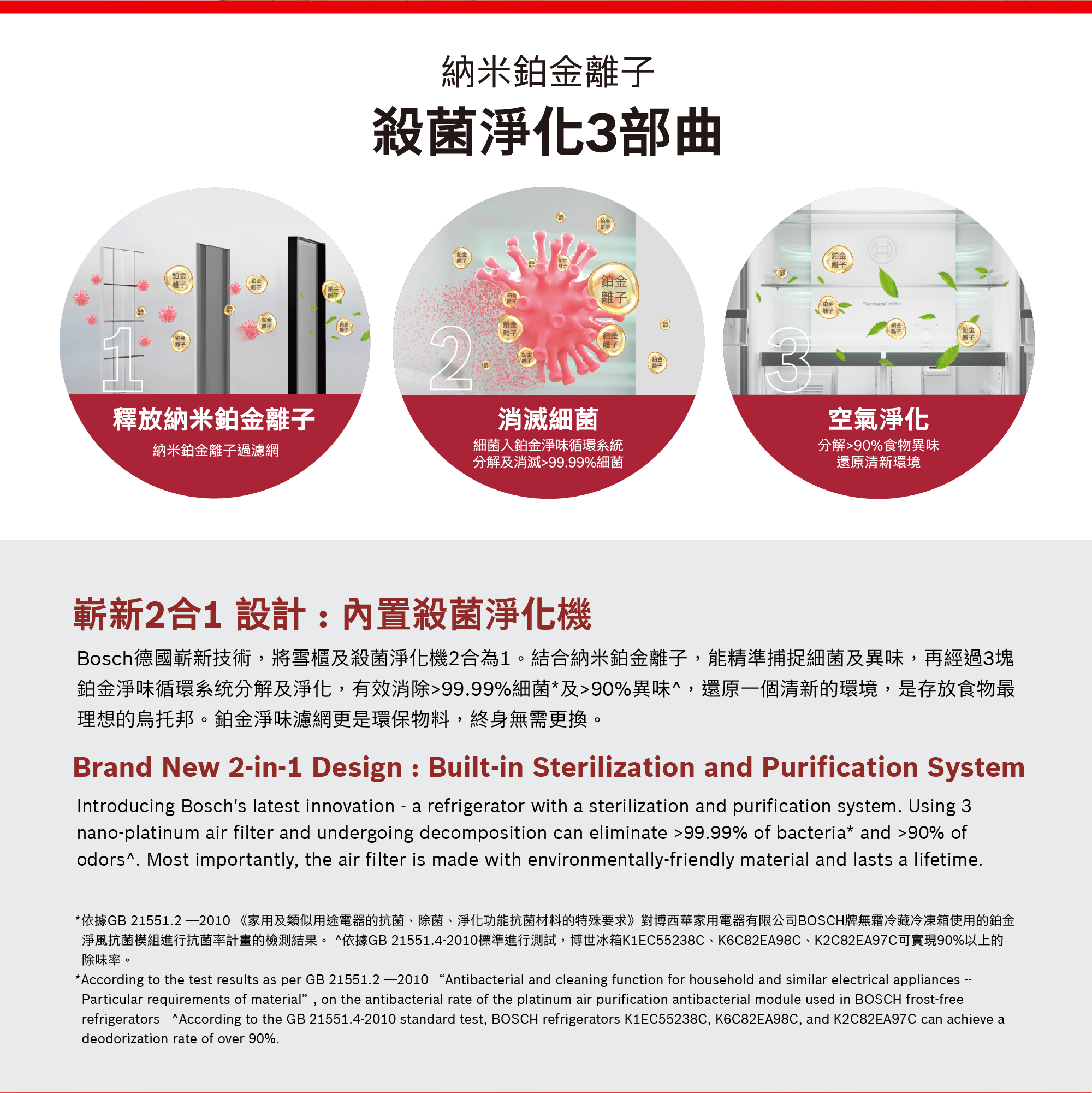 Platinum AirFilter: removes >99.99% germ (E-coli & Staphylococcus aureus) and >90% odor (Trimethylamine that leads to fish smell and Methanethiol that leads to rotten vegetables smell)
