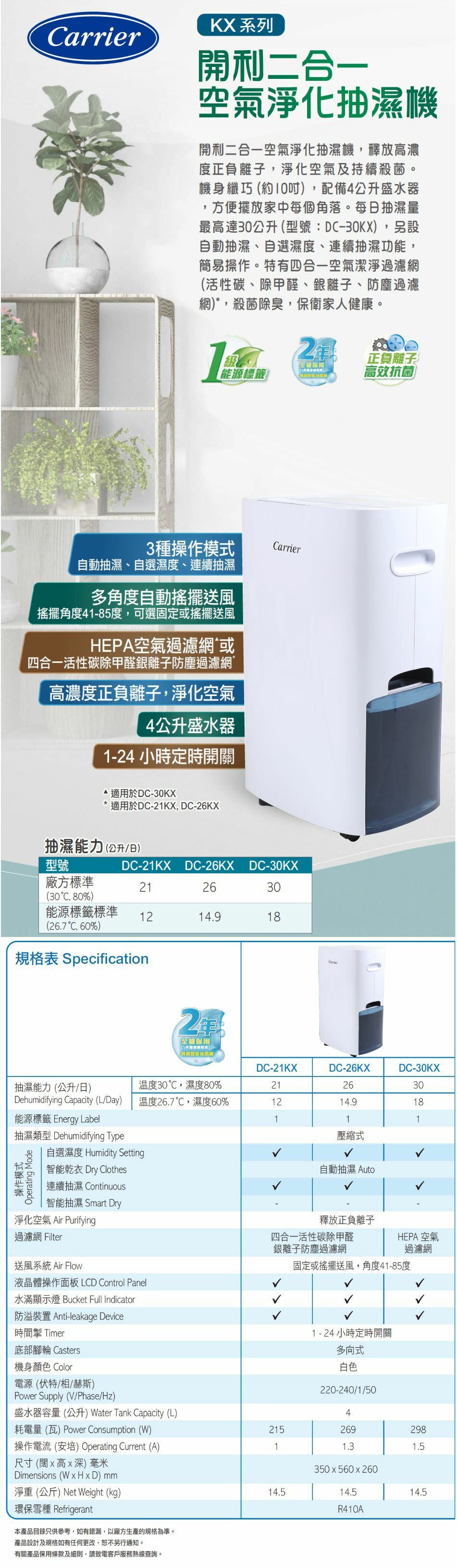 Carrier DC-21KX‧Air Purifying Dehumidifier‧21L/day‧2-year limited warranty,Compressor 5 years warranty‧