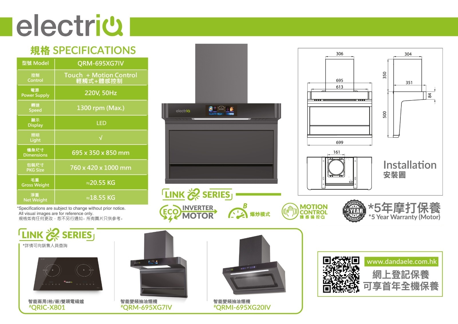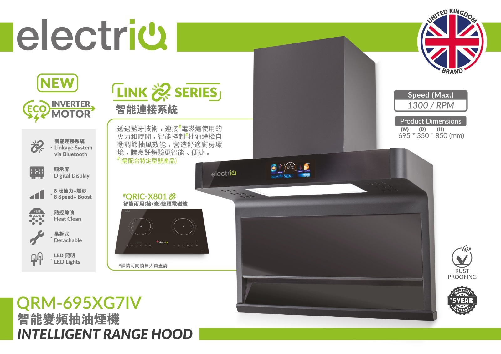 ElectriQ QRM-695XG7IV‧700mm Inverter Chimney Type Range Hood‧1-year limited warranty,Motor 5-year warranty‧