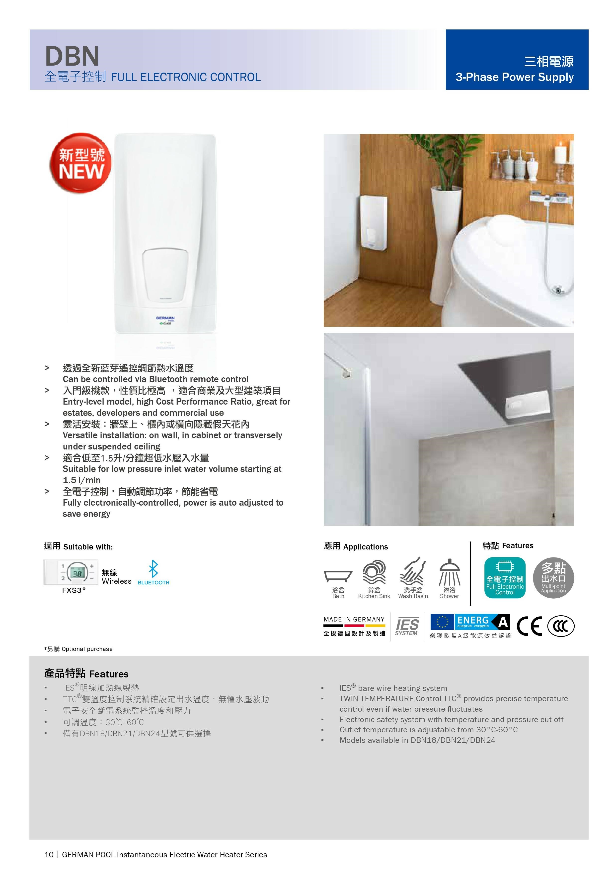 All new DBN is designed and made in Germany with state-of-the-art technology to give you the most efficient, safe and chic instantaneous electric water heater on the market today. One heater provides multi-point water outlets, whether installed on the wall at eye level, inconspicuously hidden in cabinet or under the sink, DBN conveniently supplies instant hot water to all tap outlets in your home.