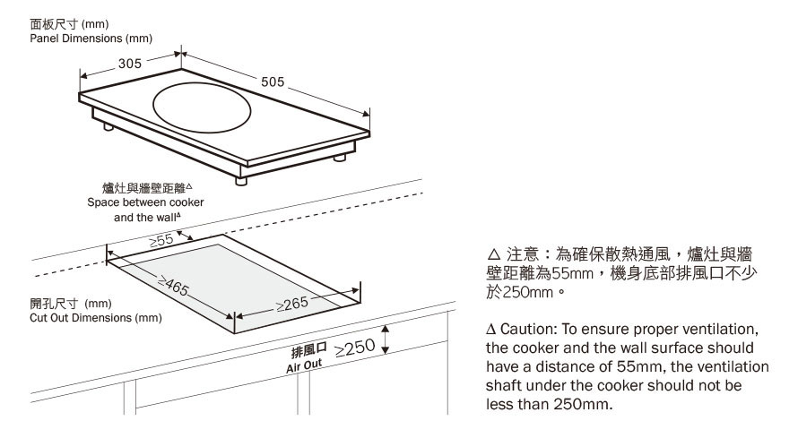 Cut-Out Dimensions(H) ≥250 (W) ≥265 (D) ≥465 mm