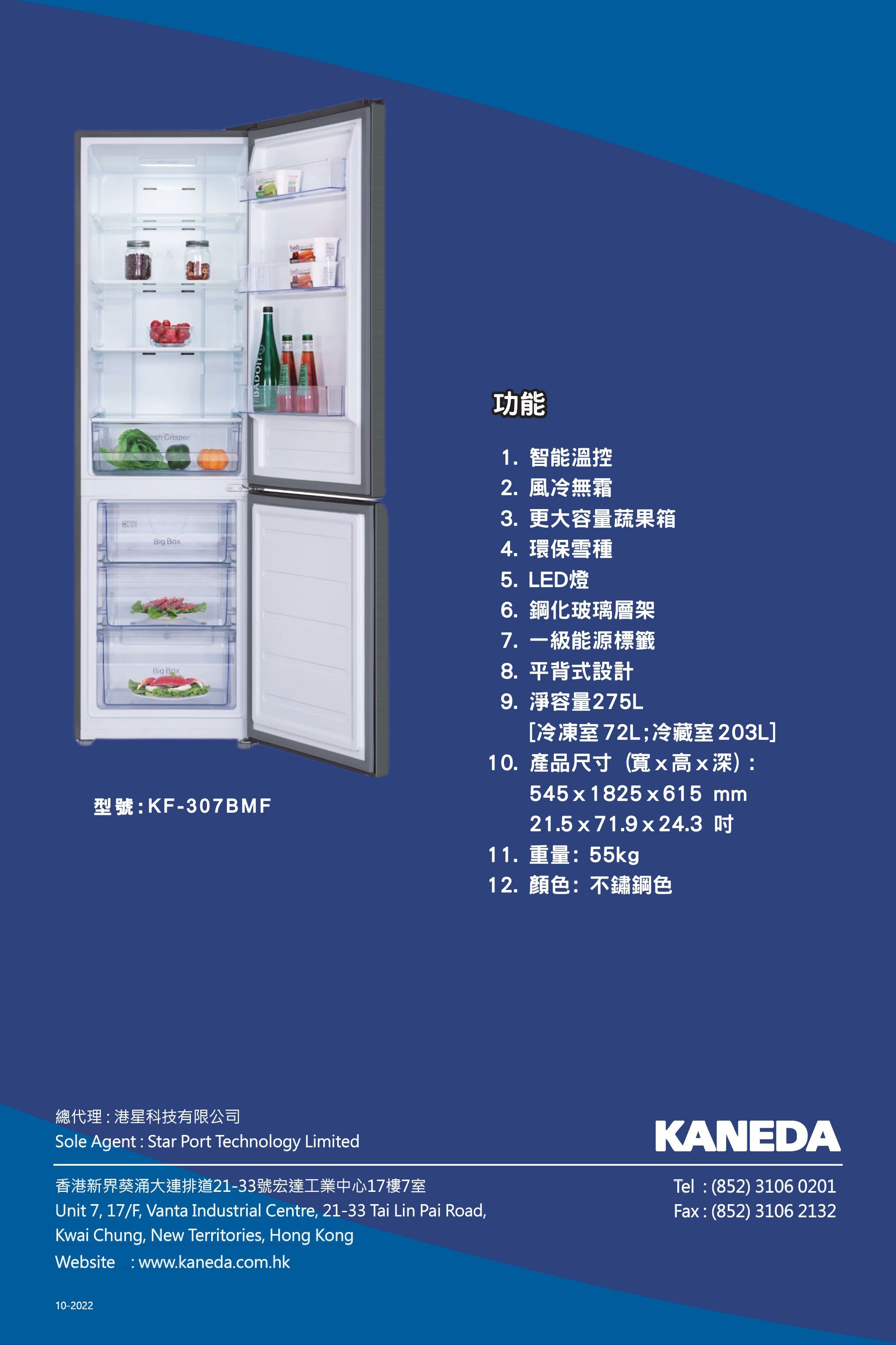 Kaneda KF-307BMF‧ Bottom-Freezer Refrigerator‧275L‧3-year limited warranty‧
