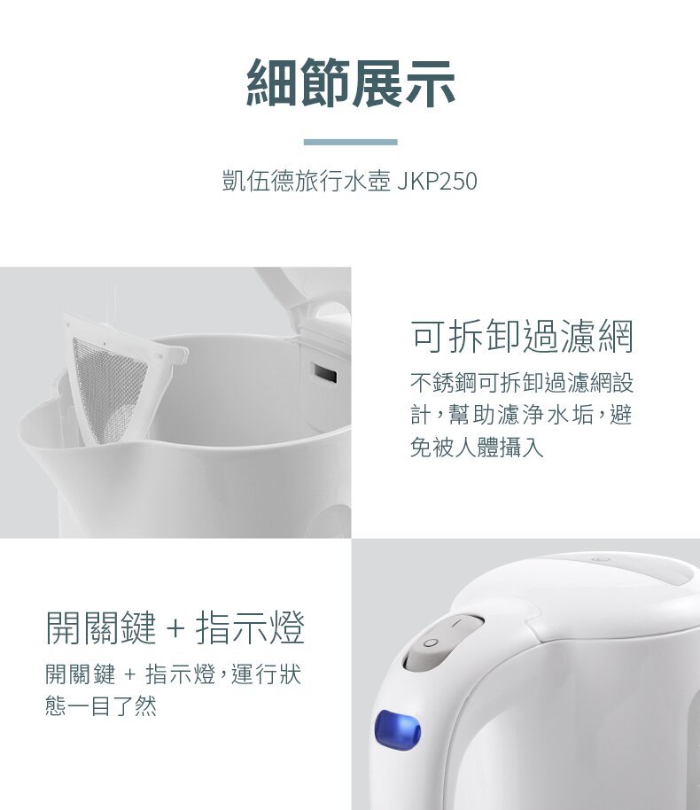 The Kenwood JKP250 Discovery Travel Kettle is a compact, 0.5 litre jug kettle, specifically designed for travelling and for small kitchens