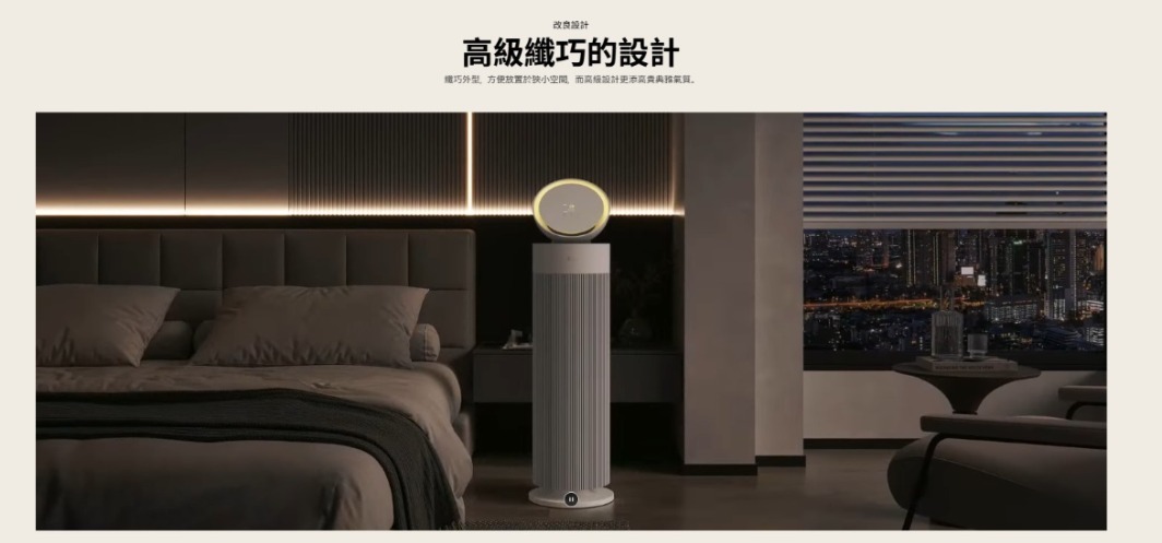 A smart indicator light on the head displays the overall air quality, monitoring both odors and dust particles.