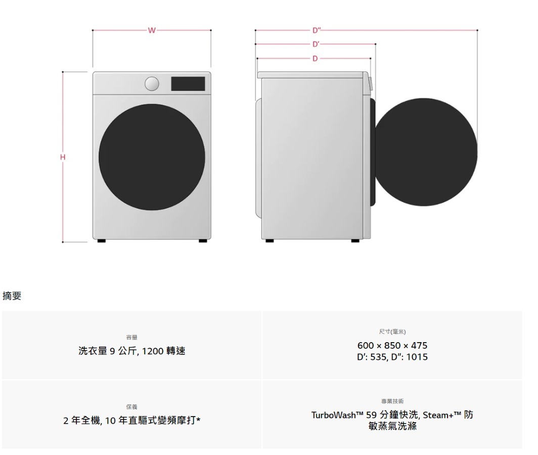 LG FV7S90V2‧Inverter Smart‧Front Load Washer‧9kg‧2-year limited warranty,10-years Motor warranty‧