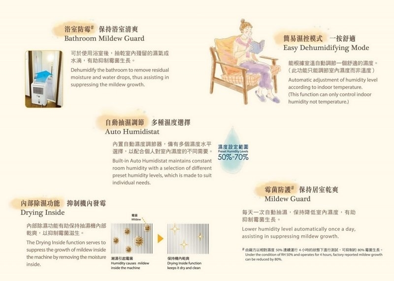 Mildew Guard function lowers humidity levels automatically once a day, suppressing mildew growth.