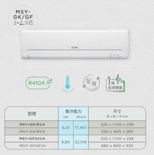 Mitsubishi Electric MSY-GF24VA/MUY-GF24VA‧2.5HP R410A‧ Inverter Cooling Split Type Air-Conditioner‧2-year limited warranty, 5-year warranty of Compressor‧