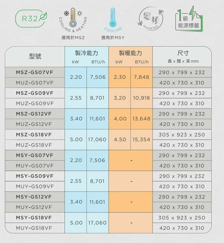 Mitsubishi Electric MSY-GS09VF/MUY-GS09VF‧1HP R32‧Inverter Cooling Split Type Air-Conditioner‧2-year limited warranty, 5-year warranty of Compressor‧