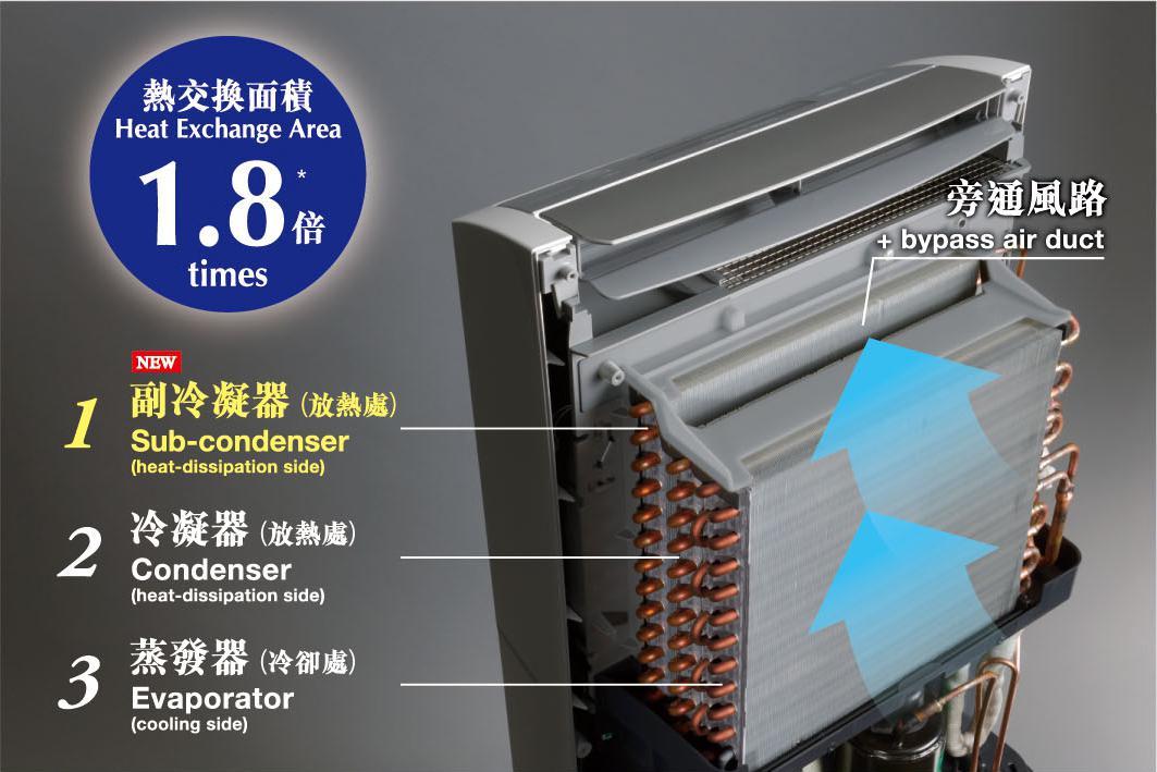 To achieve both powerful and energy-saving performance, it is necessary to further improve the cooling efficiency of heat exchanger. By adding a sub-condenser into the long-established heat exchanger, Mitsubishi Electric has created a brand new 1+2 dehumidifying system. We have also created a bypass air duct that significantly increases the volume of the cooling air, achieving unprecedented powerful and energy-saving performance.