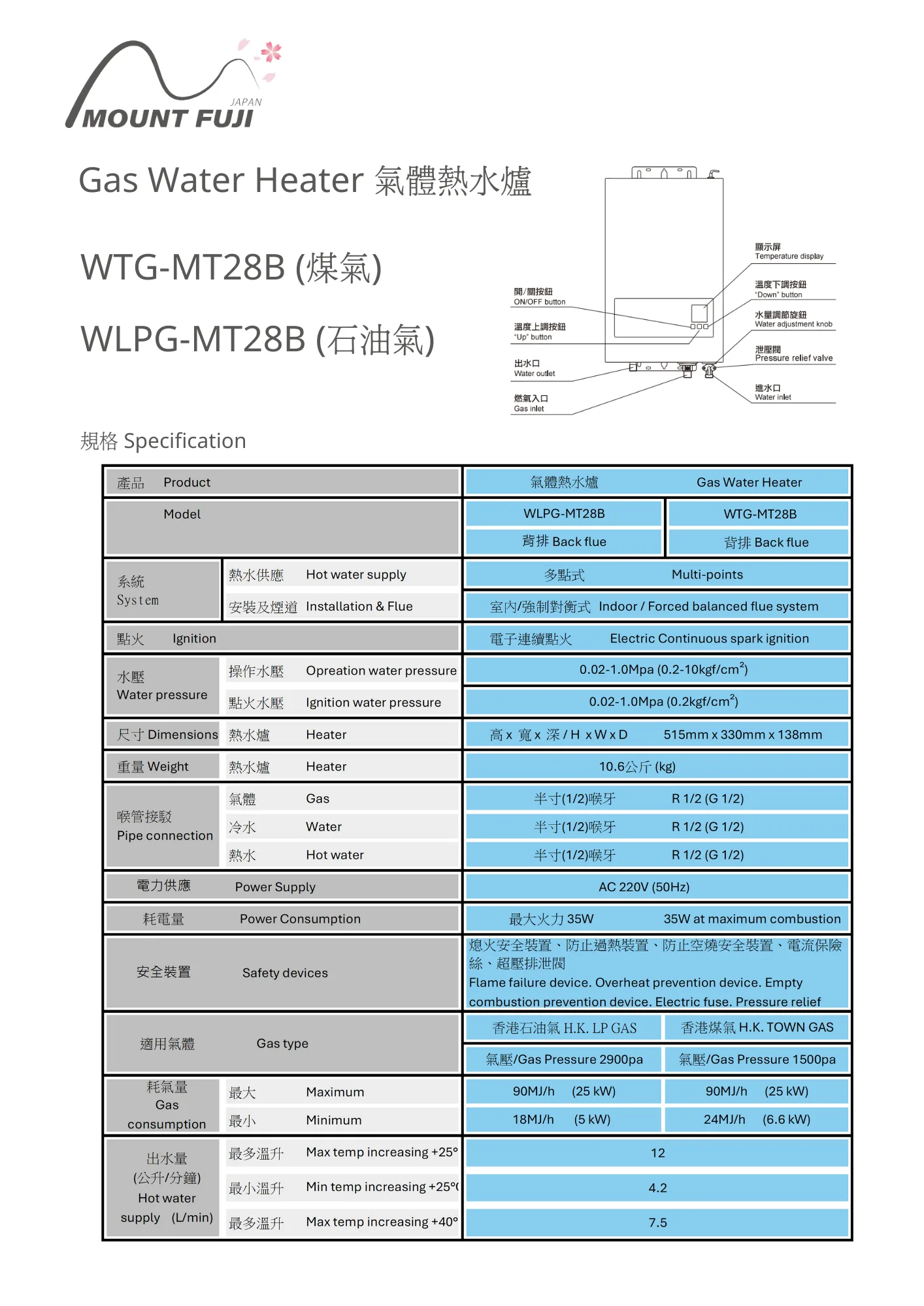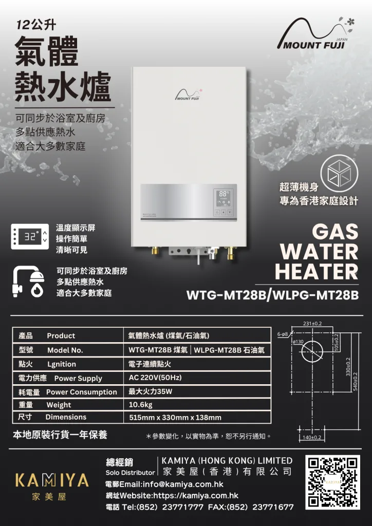 Mount Fuji W-MT28B‧Smart Temperature-modulated Gas Water Heater‧12L‧TGL‧LPS‧1-year limited warranty‧