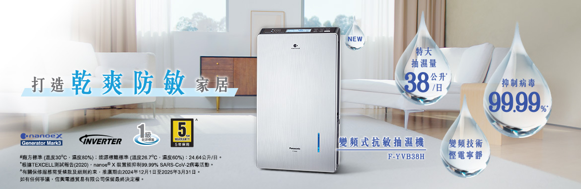 Dehumidifying Capacity (L/Day) ^38 Litres/Day (Manufacturer's Standard: Temperature 30℃, Humidity 80%)