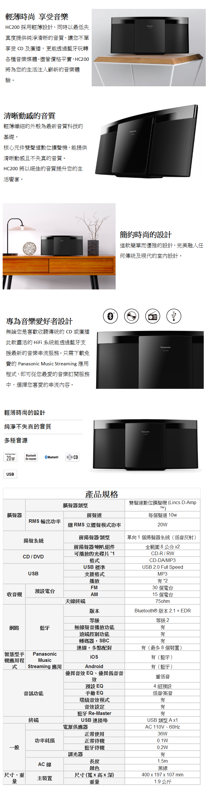 Panasonic SC-HC200‧Micro Hi-Fi‧Bluetooth wireless‧1-year limited warranty‧