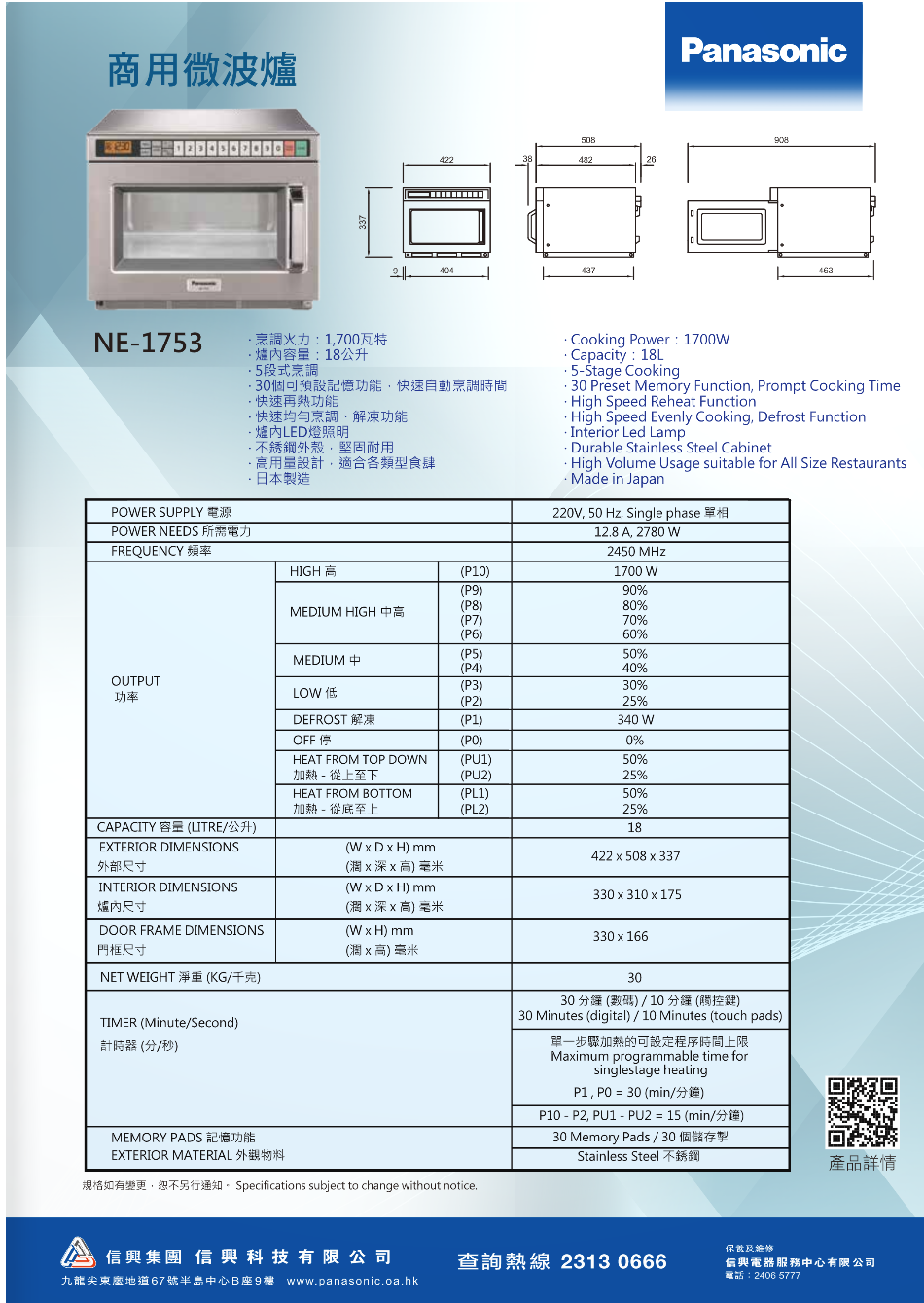 Panasonic NE-1753‧Commercial Microwave Oven‧18L‧Made In Japan‧1-year warranty in Hong Kong and Macau‧