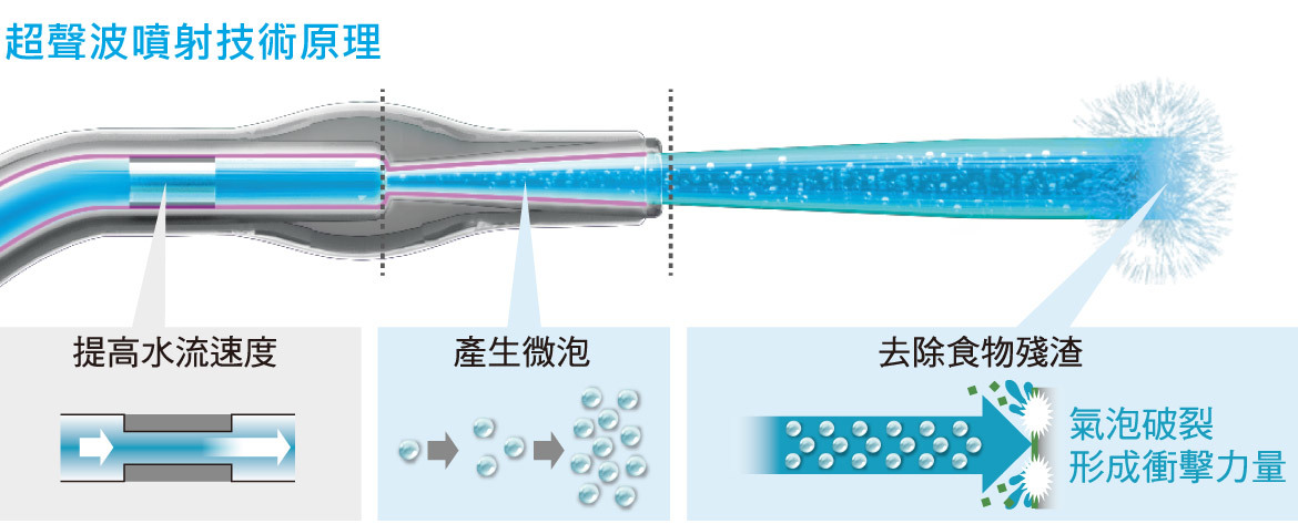 • Ultrasonic technology^ generates microbubbles inside water jet and shock waves which amplifies the power of cleaning when bubbles explode to create greater impact force (^ Ultrasonic sound is created when air bubbles explode)