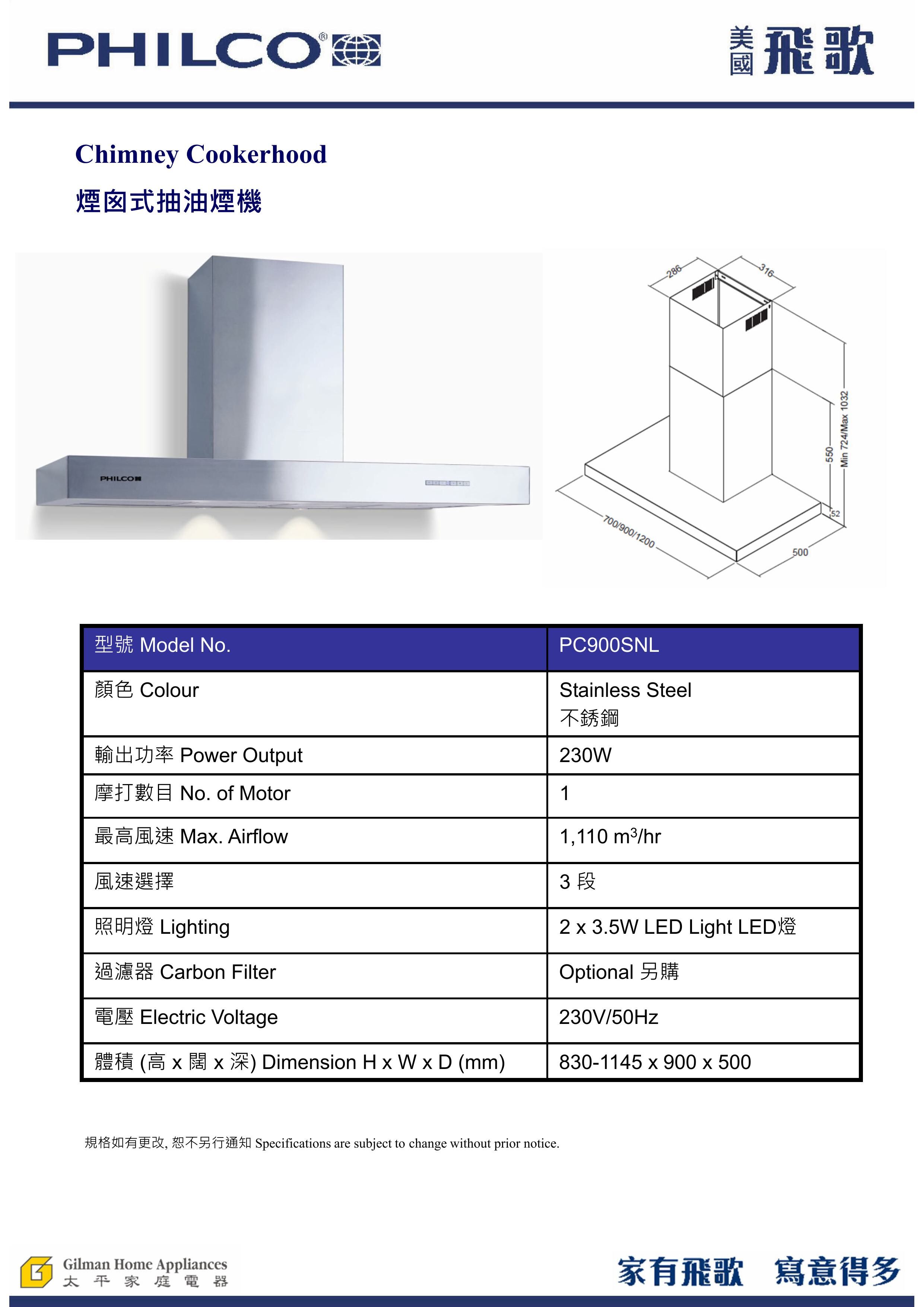 Philco PC900SNL‧900mm Chimney Type Hood‧Made in Spain‧1-year limited warranty‧