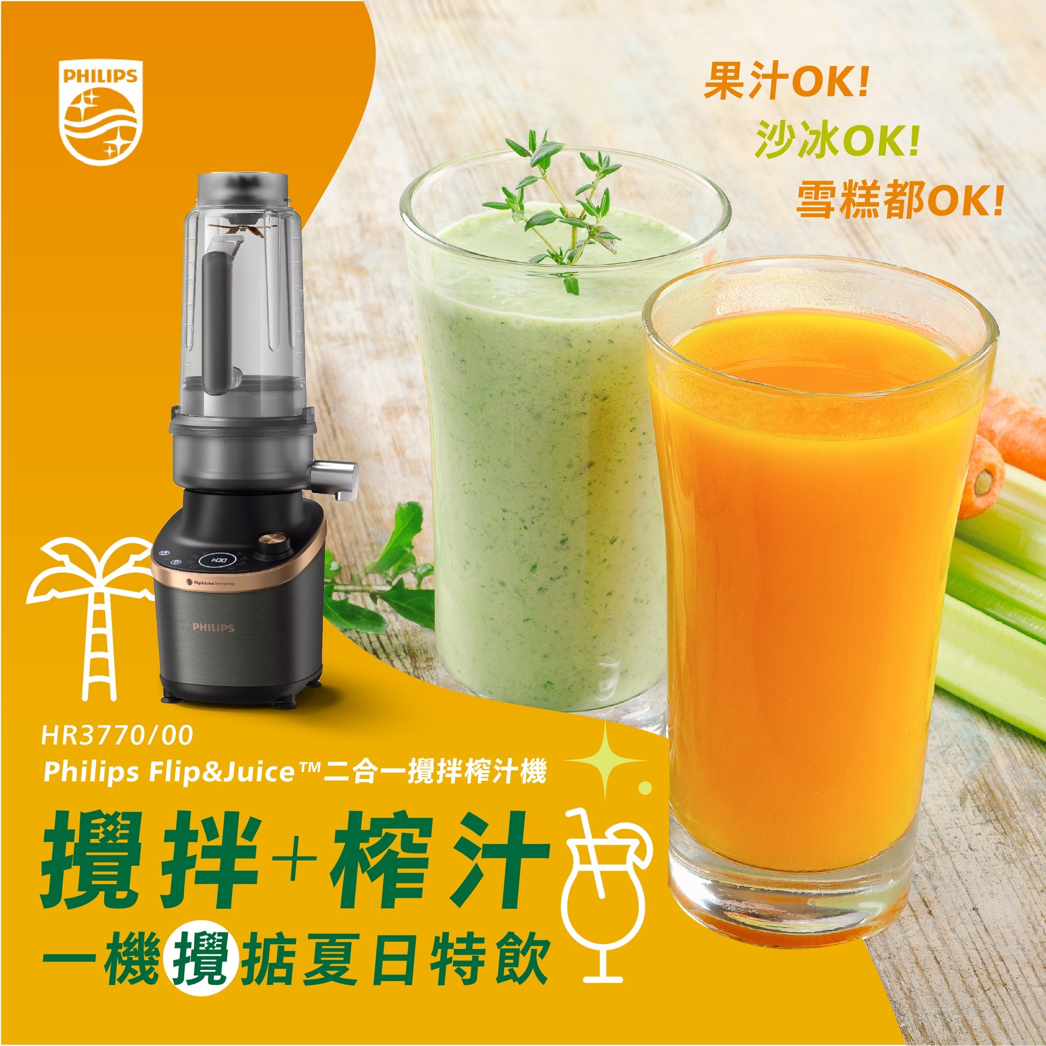 New Philips Flip & Juice Blender is our first high speed blender with juicing module. Thanks to revolutionary jar design and integrated filter, you get your drink with a texture adjusted to your family's preferences. From perfectly silky smoothies to clear or pulpy juices, our most advanced blender offers the widest variety. It combines blending and juicing in one solution, saves space in your kitchen.