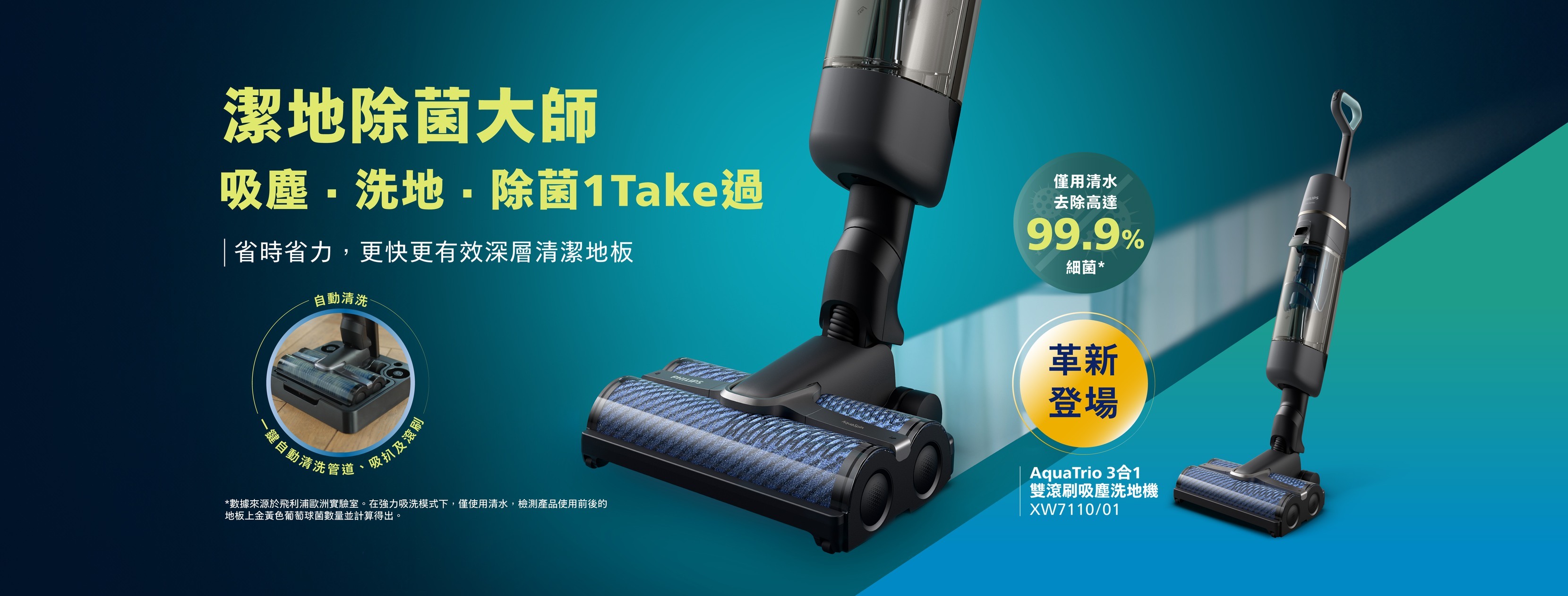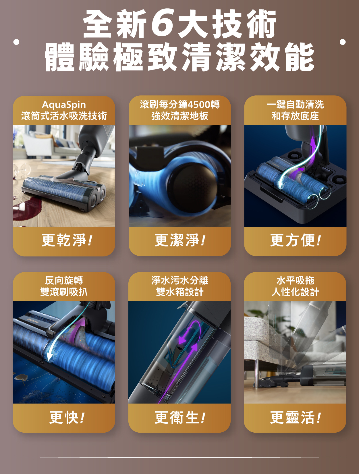 AquaSpin nozzle vacuums and actively mops hard floors effectively to remove dust, dirt, stains, spills, and up to 99.9% of bacteria*, in one go. The unique nozzle is designed to pick up dirt at both the front and back of the nozzle to make every stroke count.