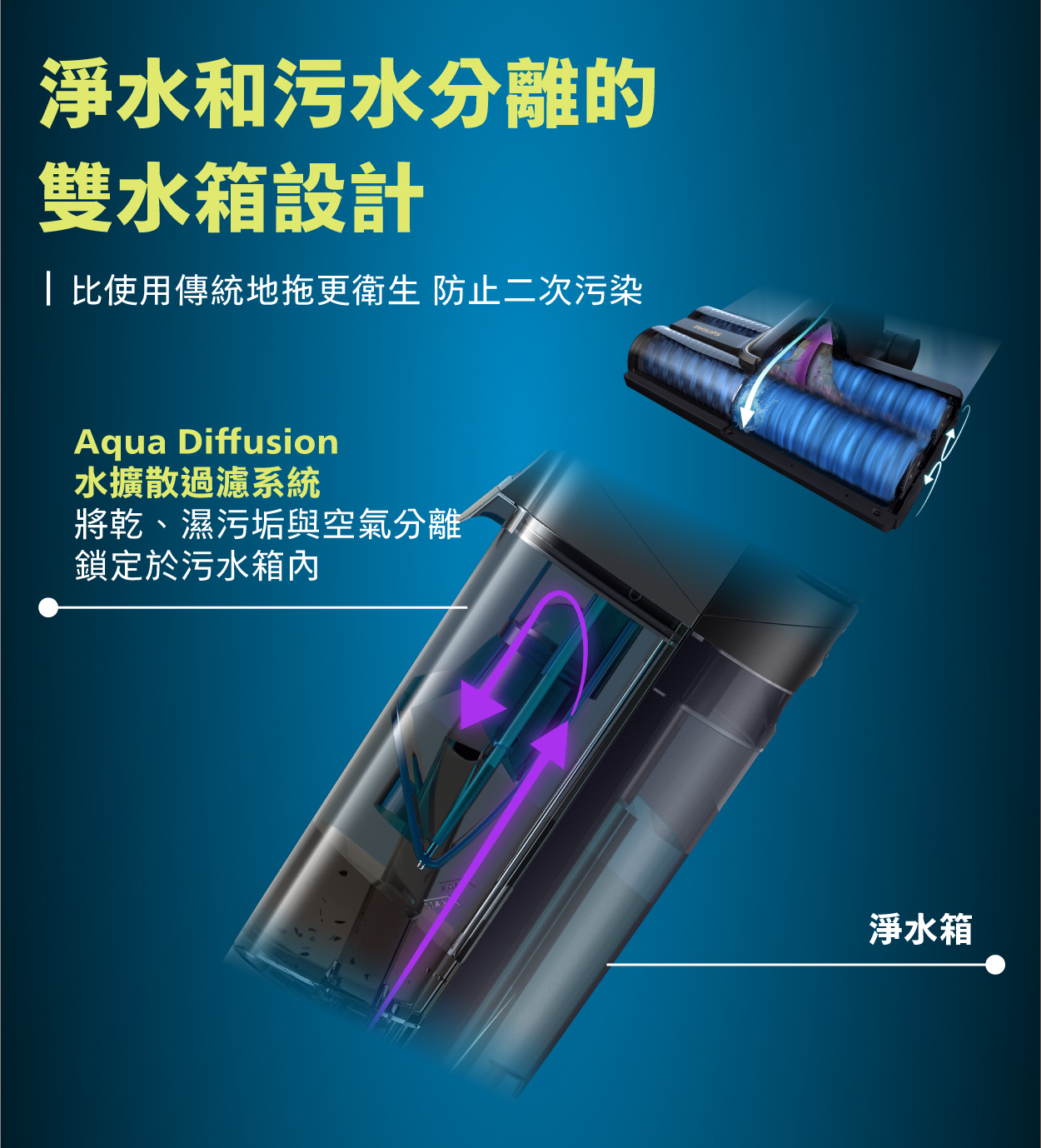 All the picked-up wet & dry dirt is immediately separated and locked in the dirty water tank. You can empty tanks at any point, without having to touch the dirty mopping water.
