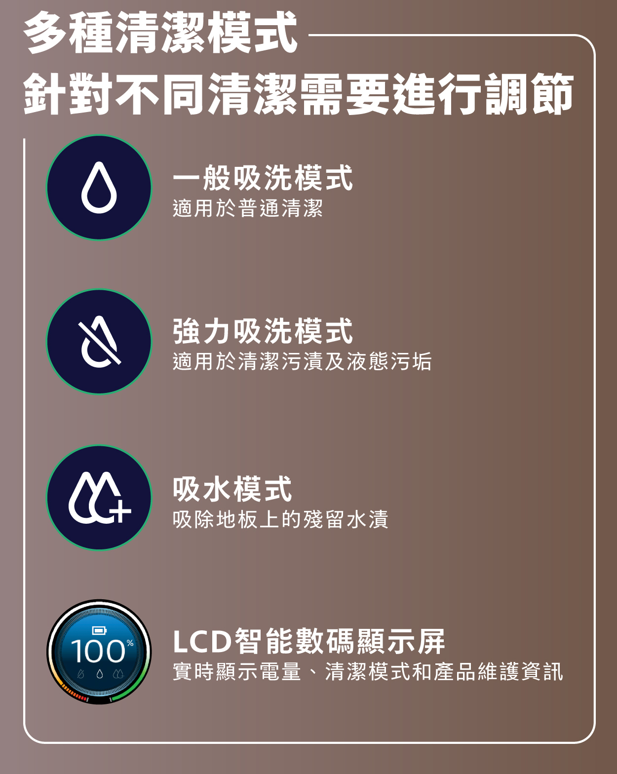 The appliance has 3 cleaning modes. Normal wet mode intended for regular wet cleaning. The intense wet mode is for cleaning stubborn stains. Water absorption mode to pick up remaining moisture from the floor. Use the Digital LCD smart screen to switch power settings.