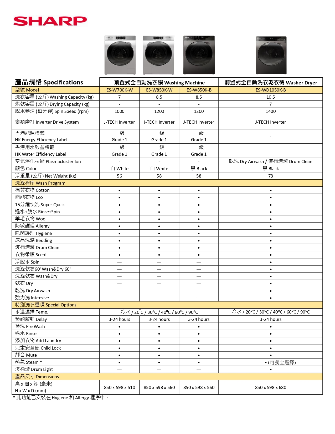 Sharp ES-W700K-W‧Inverter Front Loading Washer ‧Wash 7Kg‧2-year limited warranty 10-year motor‧