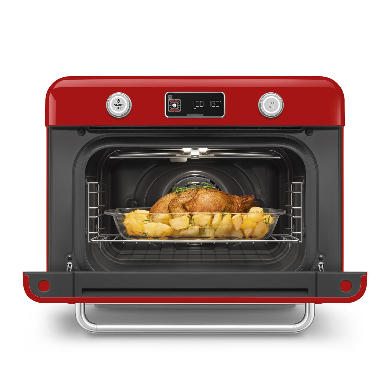 The Smeg COF01BLUK 30L 50's Style Countertop Combi Oven in Red seamlessly blends classic aesthetics with modern culinary technology. With its practical 30-liter capacity and versatile 10-in-1 multi-function design, it caters to diverse cooking needs, from precise steaming to efficient baking and air frying. This appliance features a durable enamel interior, a 900W grill element, and a 700W bottom heating element for even heat distribution. Its wide electronic temperature control range, spanning from 40°C to 230°C, offers precise cooking control for a variety of dishes.