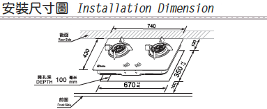 Cut Hole Dimension 開孔尺寸 W闊 670 x D深 350 x H高 100mm, Rear 後方預留 190mm