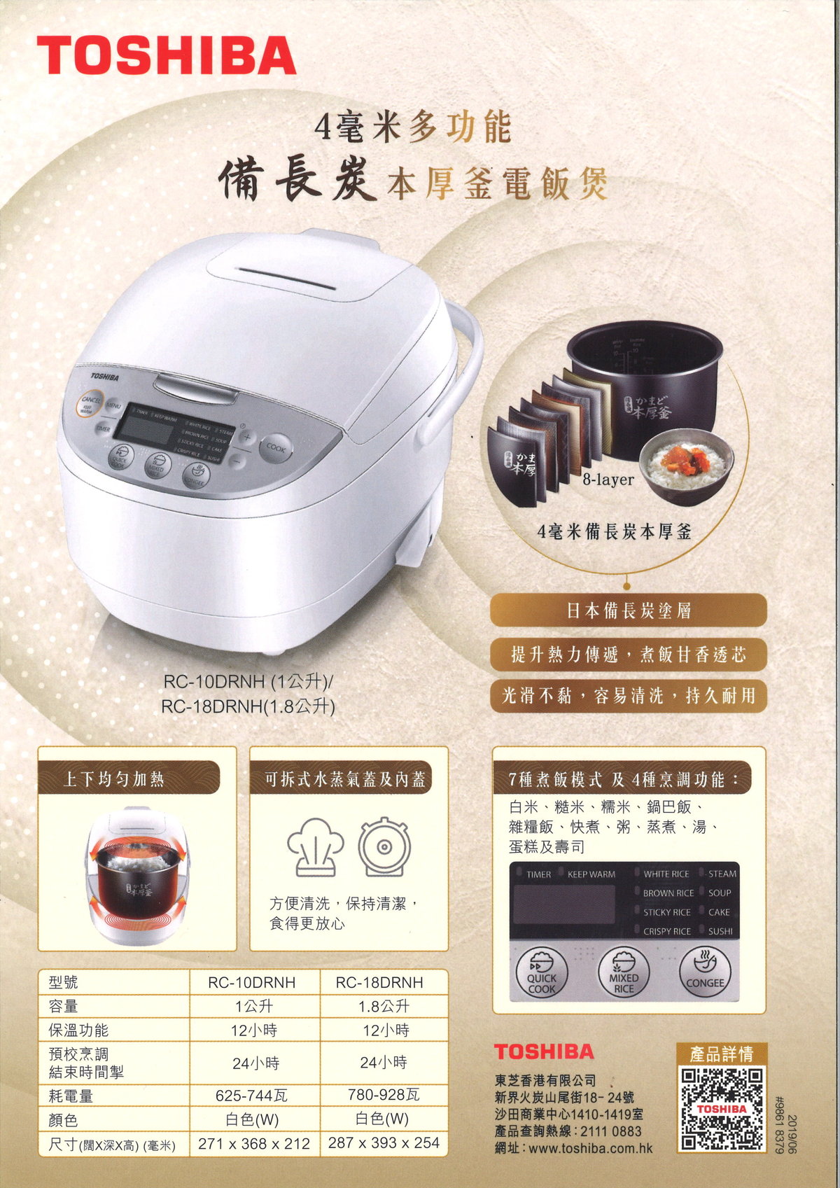 | Function | White Rice, Brown Rice, Sticky Rice, Crispy Rice, Mixed Rice, Quick, Congee, Steam, Soup, Cake & Sushi |