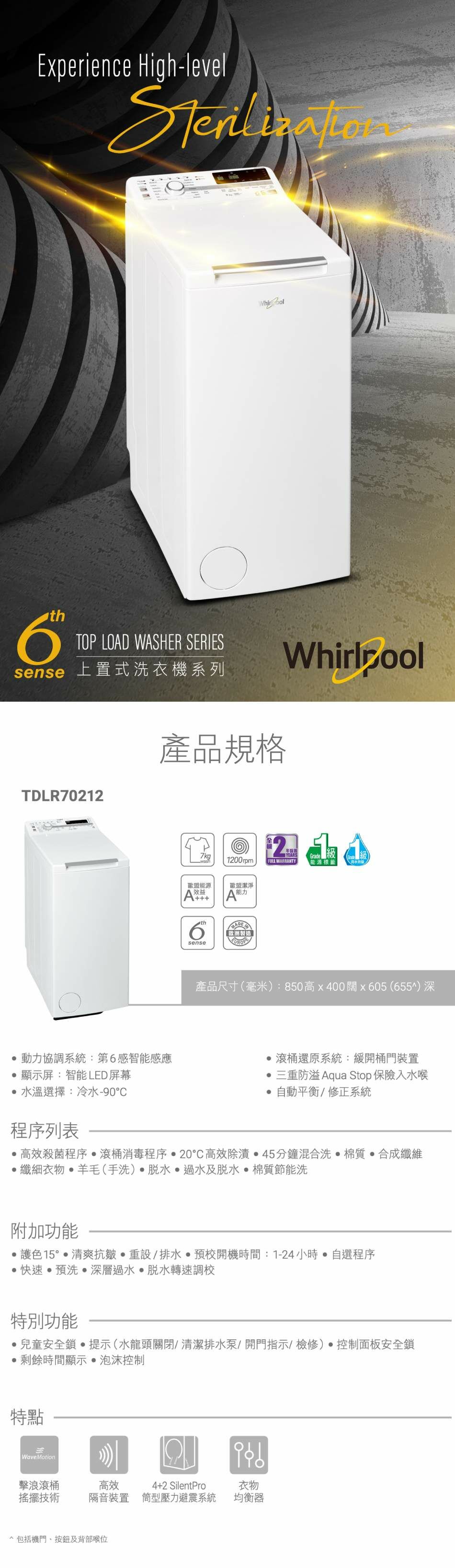 Whirlpool TDLR70212‧Top Loading Washer‧7kg ,1200RPM‧Made in Slovakia‧2-year limited warranty‧
