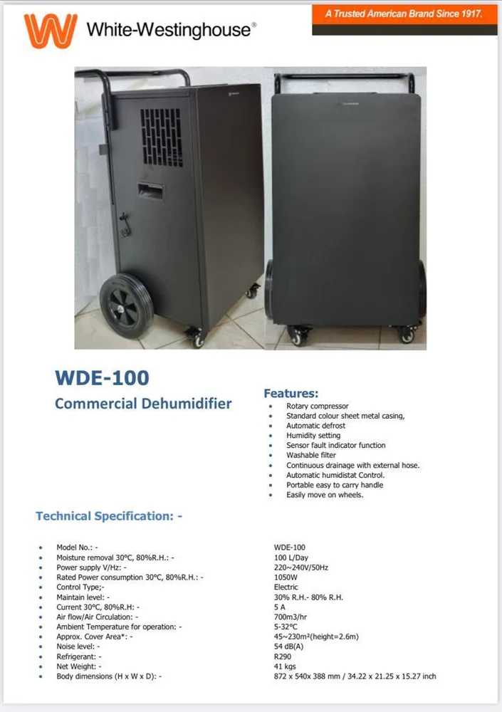 White-Westinghouse WDE100‧Dehumidifier‧100L‧1-year limited warranty‧