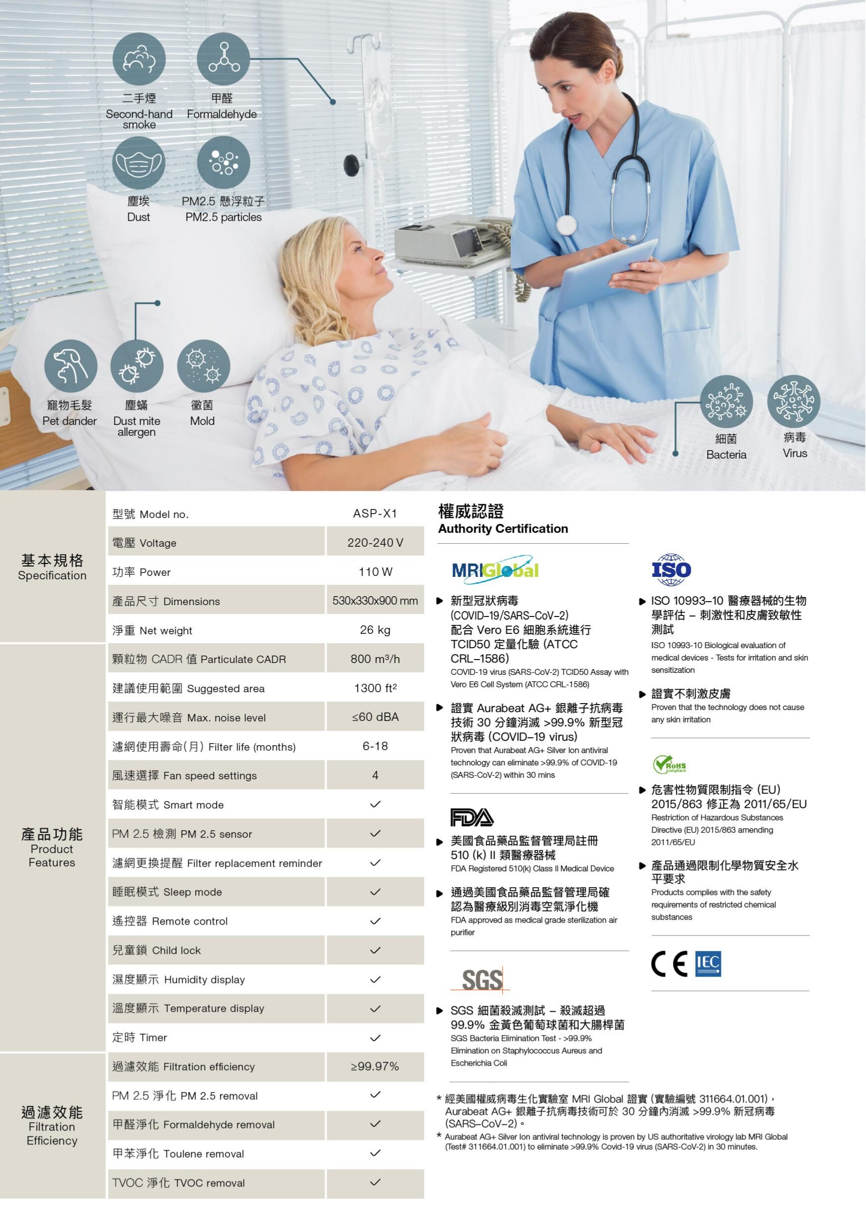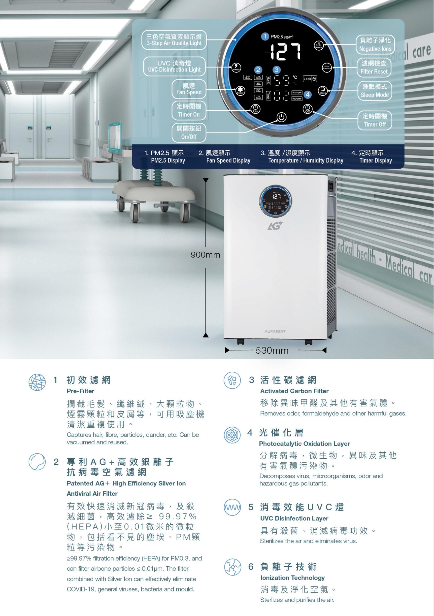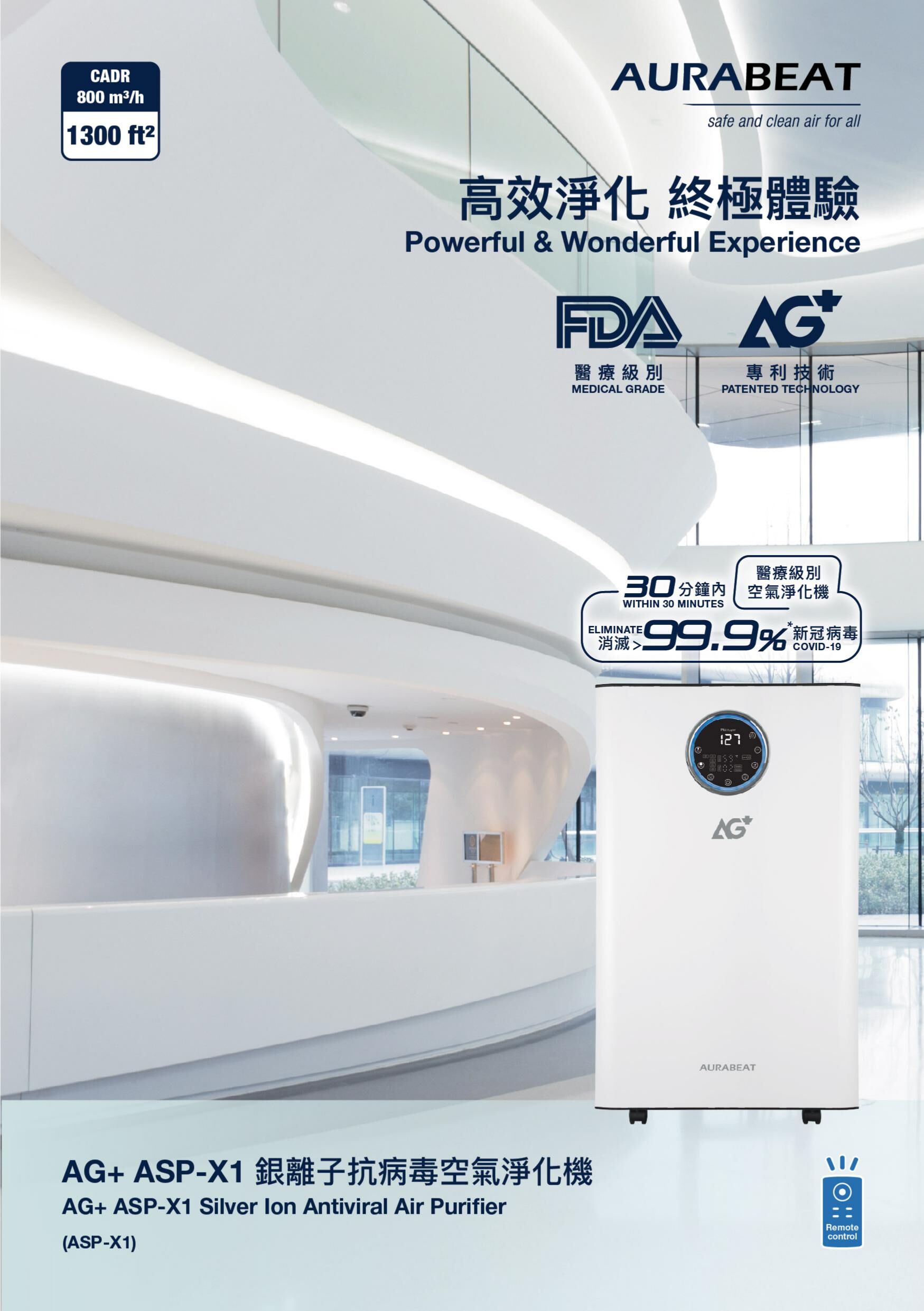 Aurabeat ASP-X1‧AG+ 醫療級‧銀離子UVC‧除菌空氣淨化機‧約130平方米‧香港行貨,原廠1年保養‧