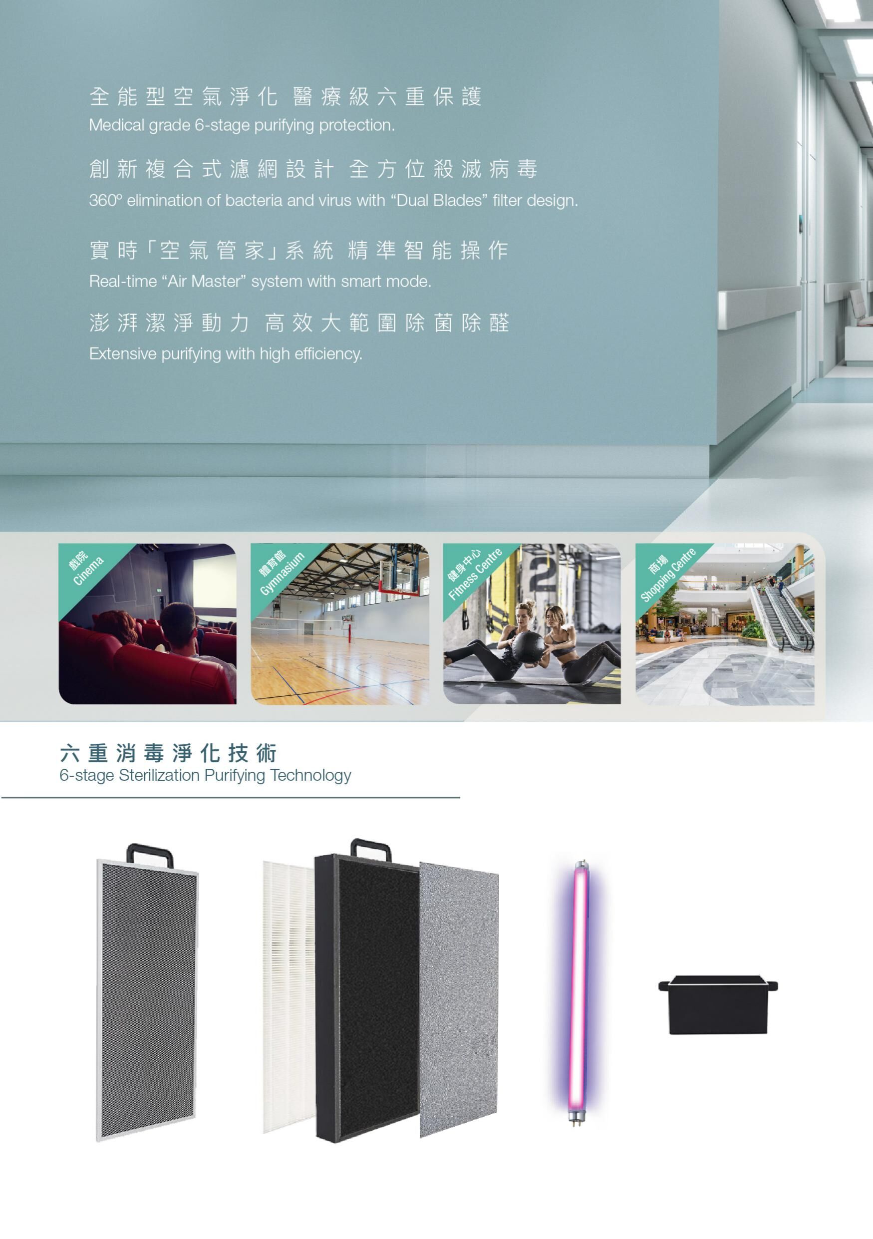 結合AG+高效銀離子抗病毒 空氣過濾器、活性炭過濾網、光催化 層、UVC消毒及負離子技術