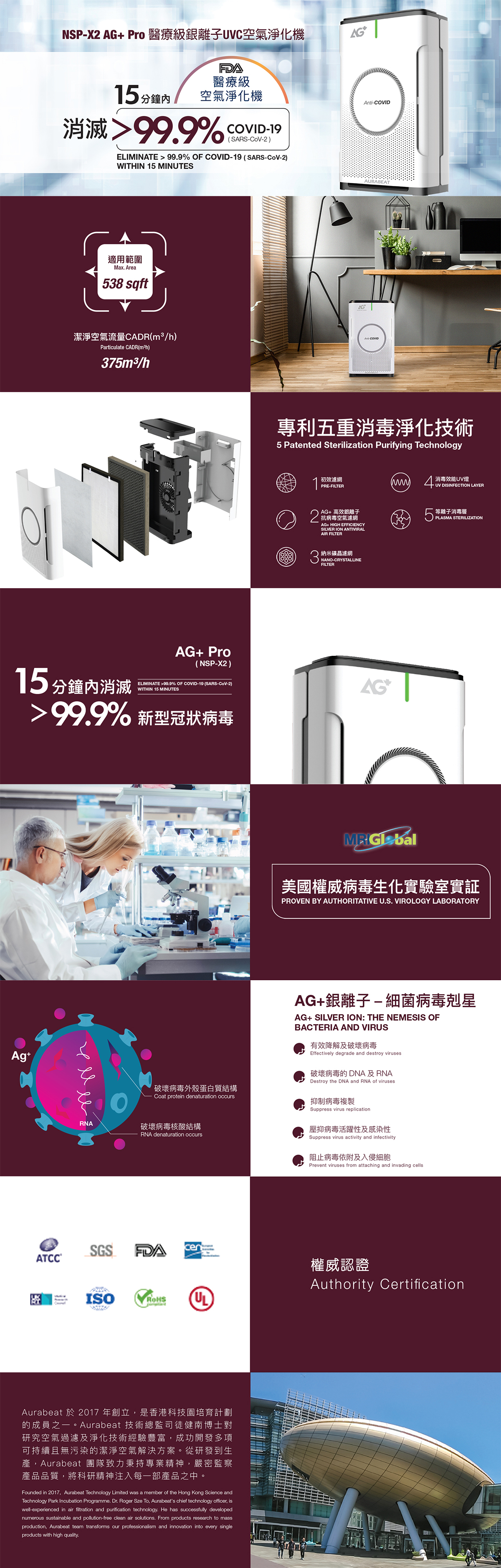 Aurabeat NSP-X2‧AG+ 醫療級‧銀離子UVC‧除菌空氣淨化機‧約538平方米‧香港行貨,原廠1年保養‧