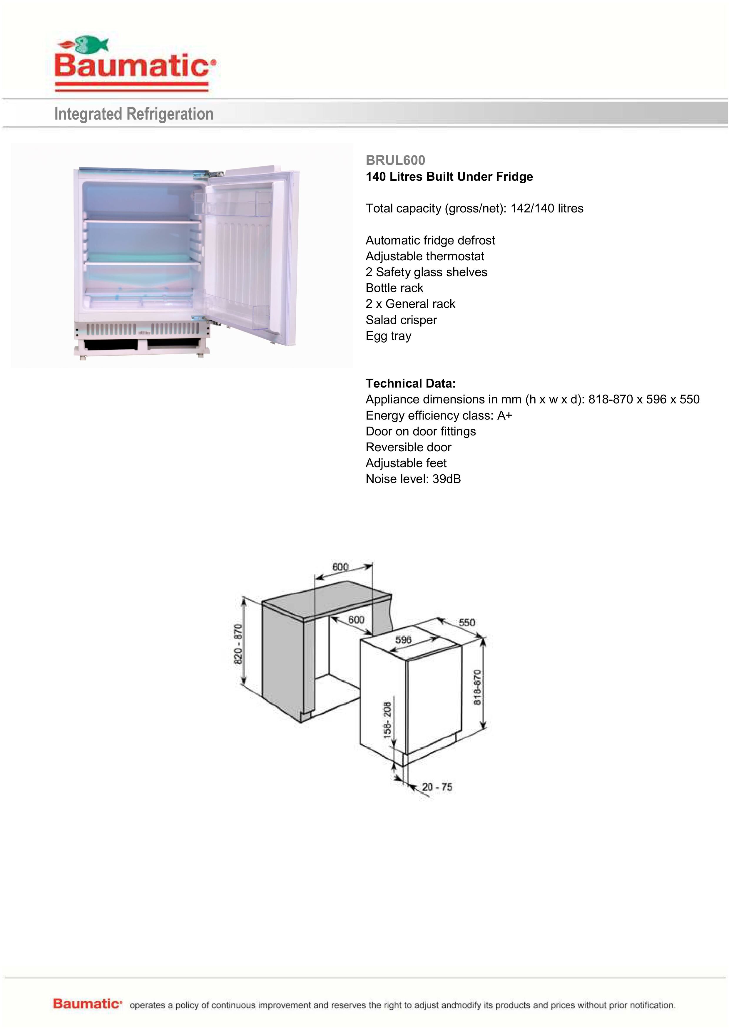 Baumatic BRUL600(可改門鉸)‧嵌入式單門雪櫃‧136公升‧香港行貨,原廠1年全機保養‧