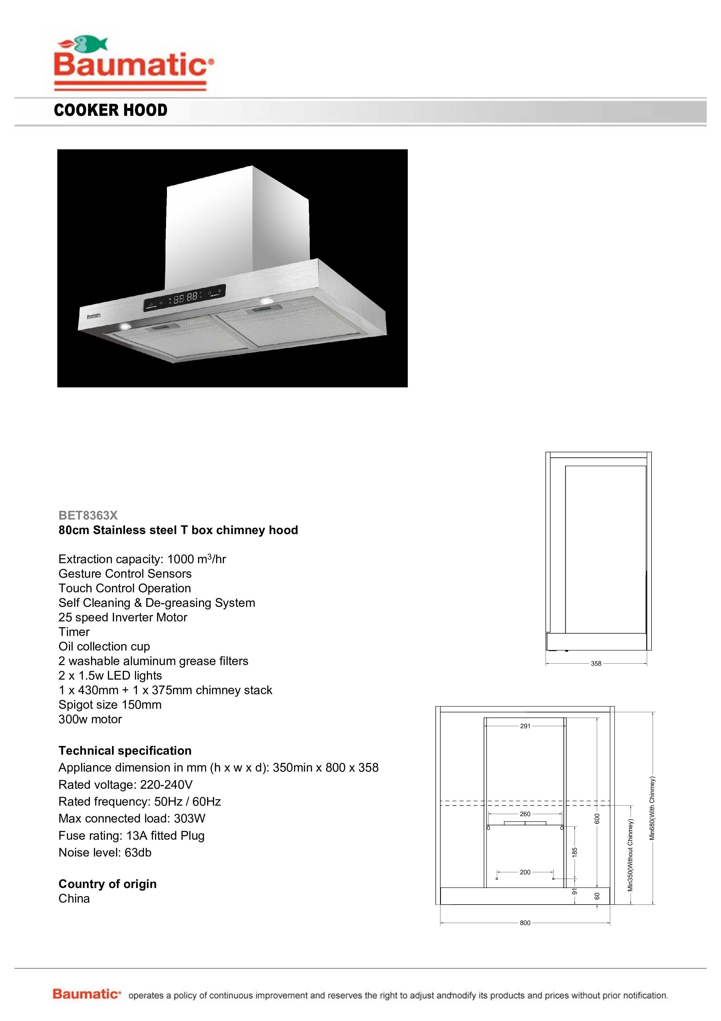 Baumatic BET8363X‧800mm 超薄變頻‧煙導式抽油煙機(手掃開關/自動清洗)‧香港行貨,原廠1年保養‧