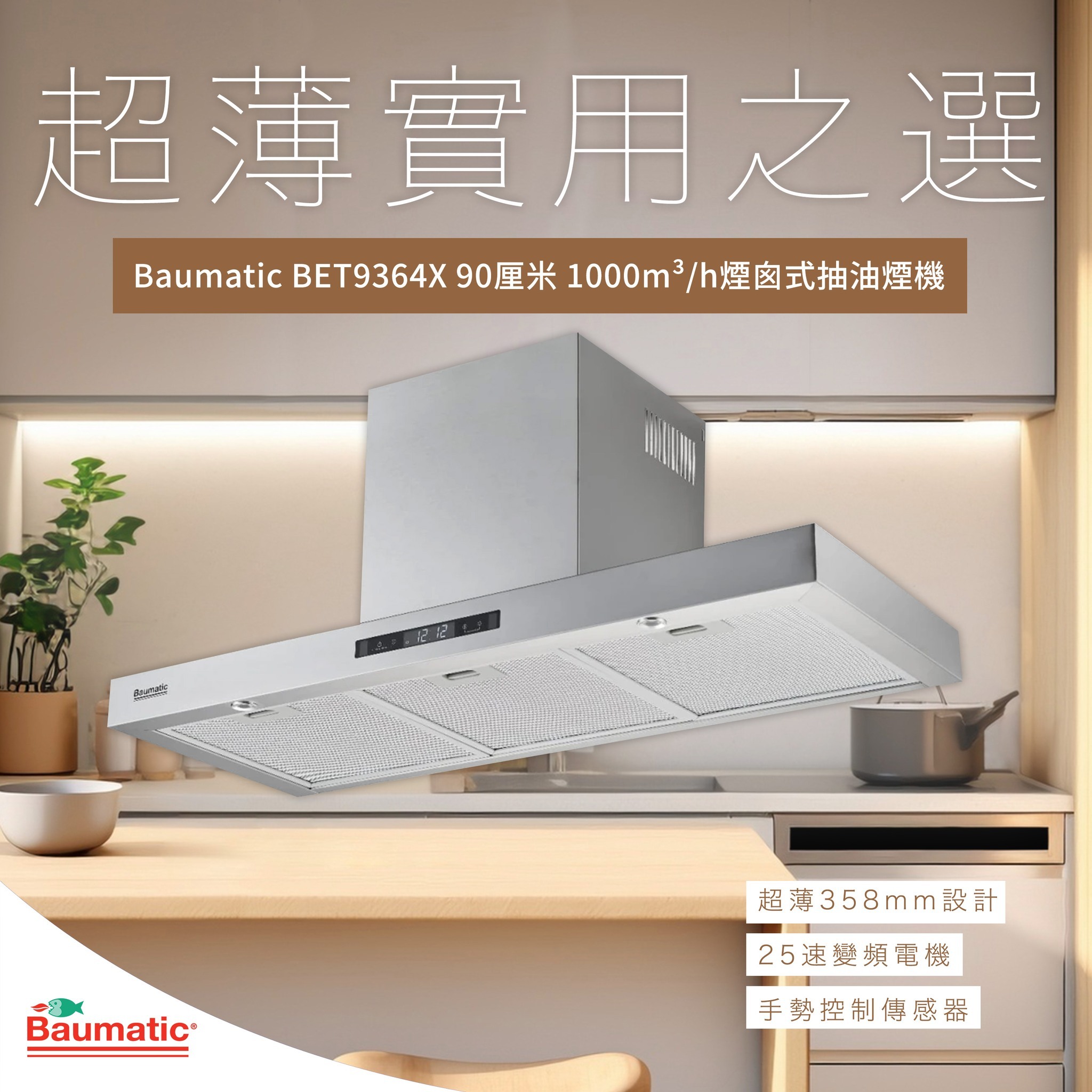 Baumatic BET9364X‧900mm 超薄變頻‧煙導式抽油煙機(手掃開關/自動清洗)‧香港行貨,原廠1年保養‧