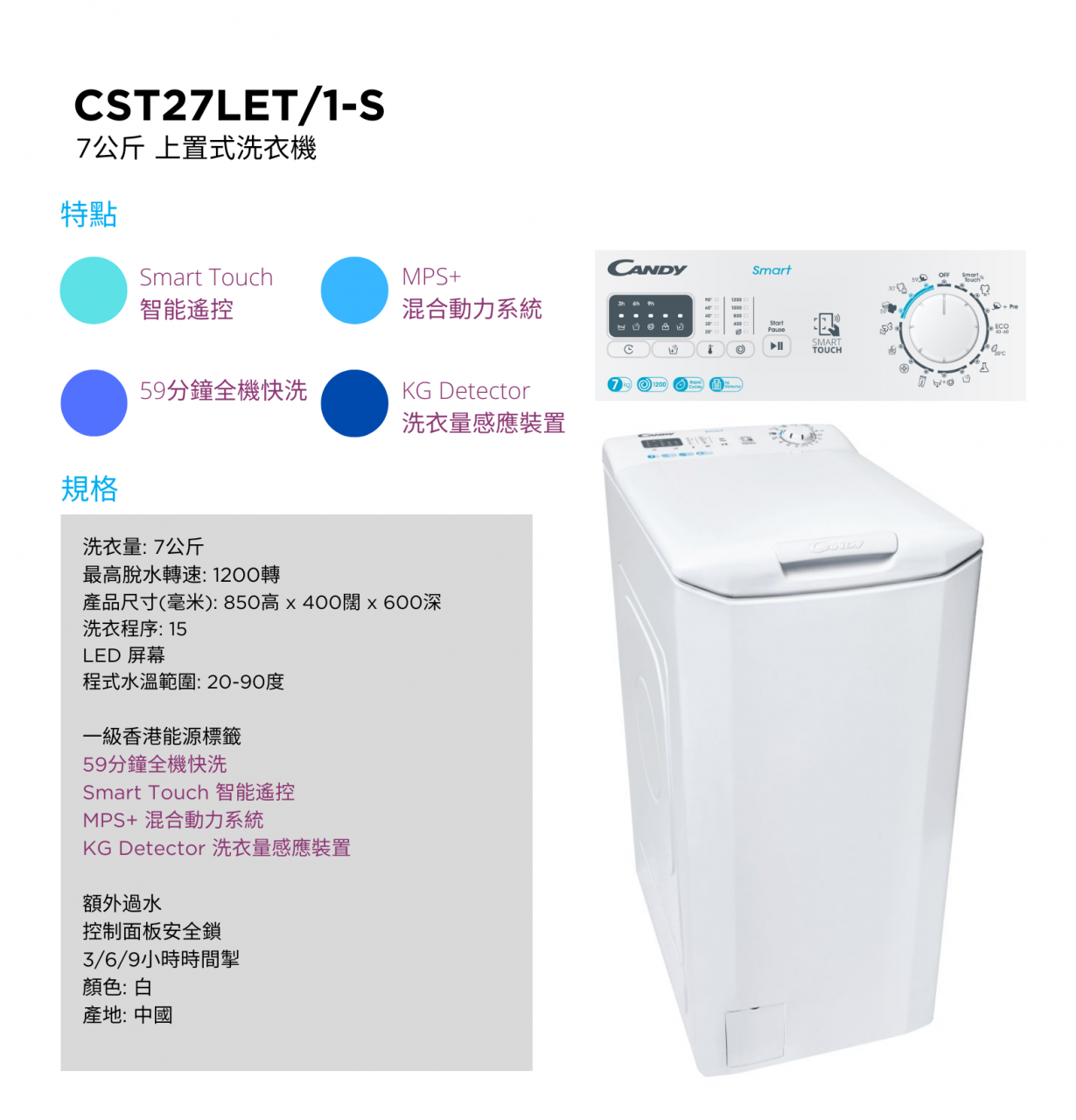 金鼎 Candy CST27LET/1-S‧上置式洗衣機‧7.0公斤,1200轉‧香港行貨,原廠2年保養‧
