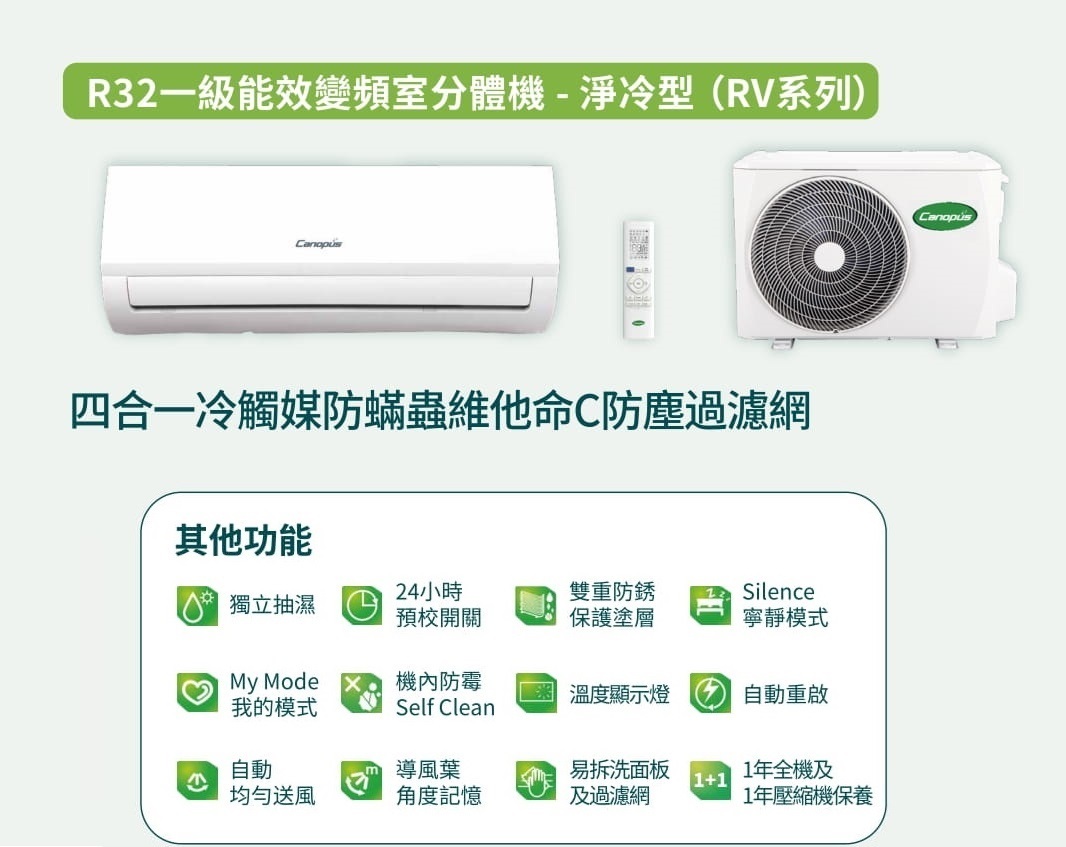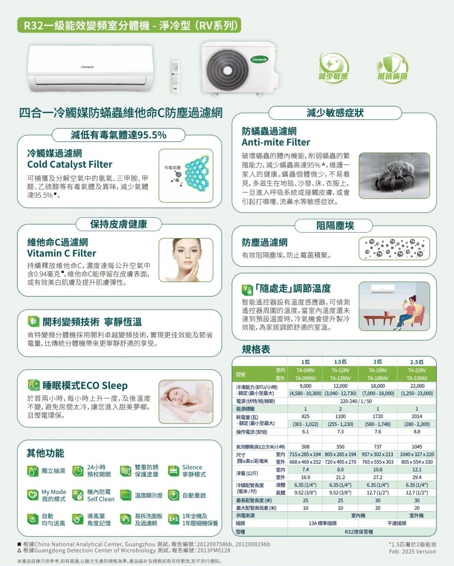 肯特 Canopus TA-18RV/TA-18RAV‧2匹 R32 變頻淨冷‧分體式冷氣機‧香港行貨,原廠1年保養