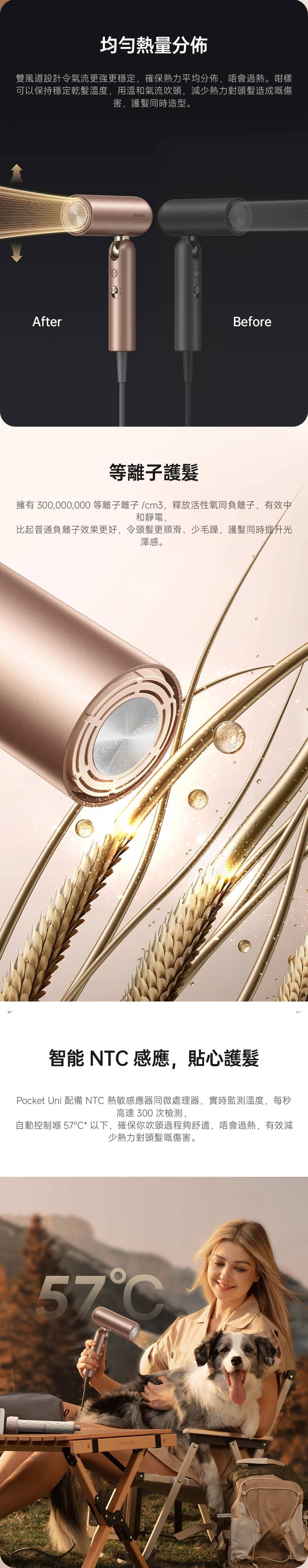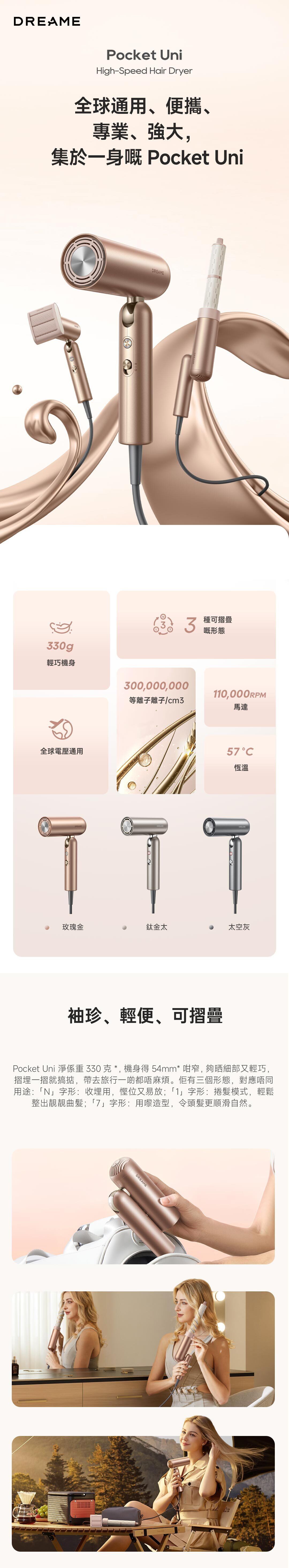DREAME Pocket Uni 是一款設計便攜的高速風筒,專為旅遊和日常使用而設計,提供快速乾髮和專業護髮效果。
