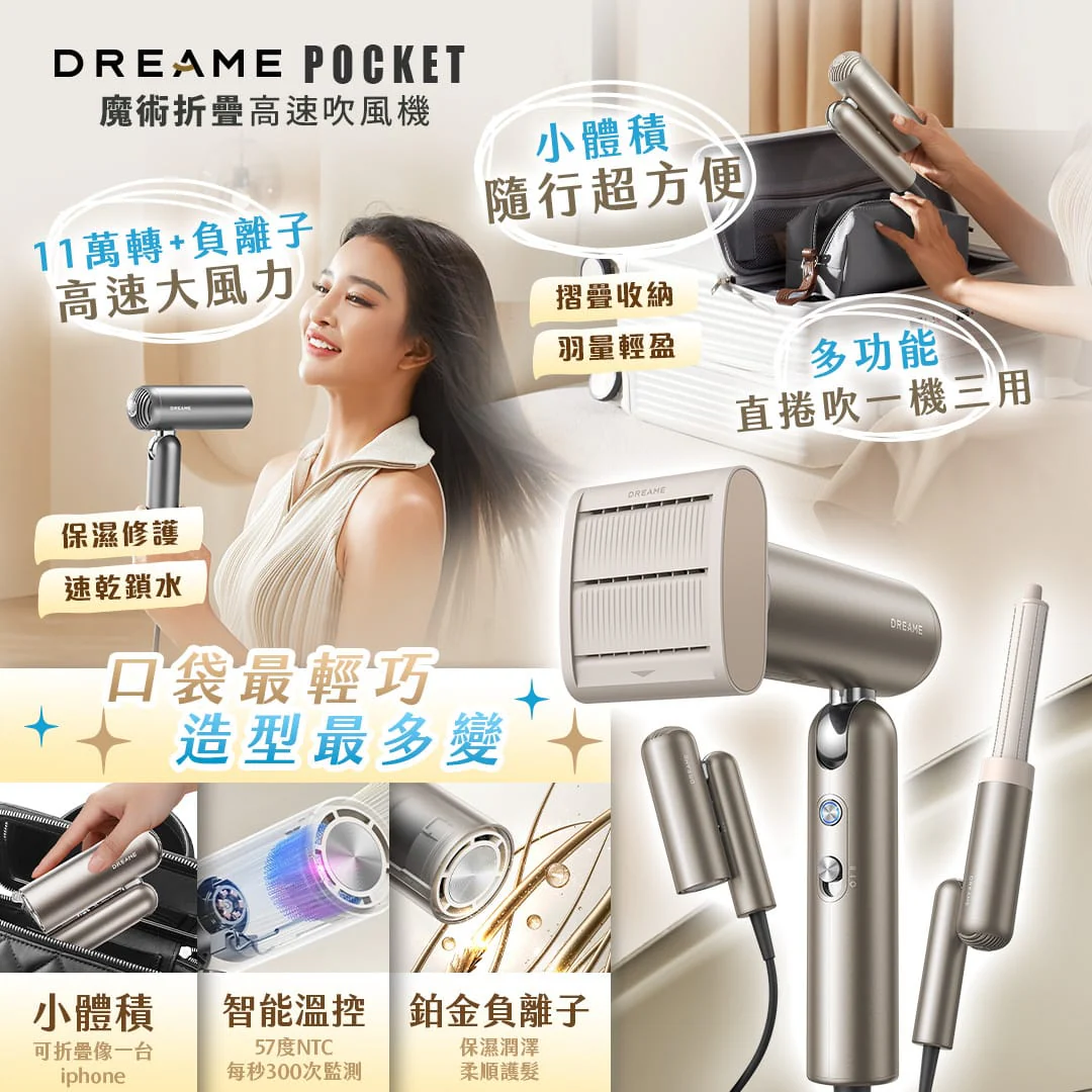 追覓 Dreame Pocket Uni‧魔術折疊高速負離子‧全球通用高速旅行風筒(100-240V)‧香港行貨,原廠1年保養‧