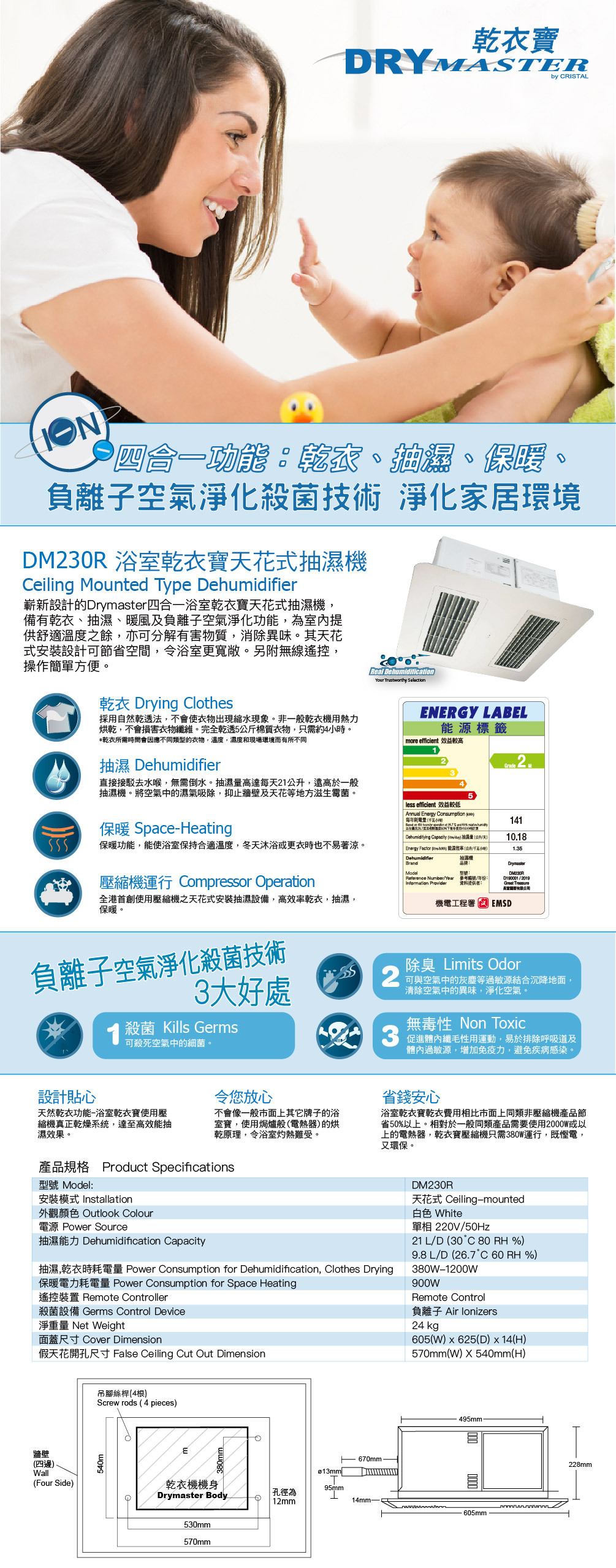 Drymaster每24小時抽濕量高達21公升,效能強勁Drymaster嘅內循環功能可保持室內清爽及空氣流通,負離子空氣淨化功能亦可分解有害物質,使家人能安心使用浴室,確保浴室衛生狀況。