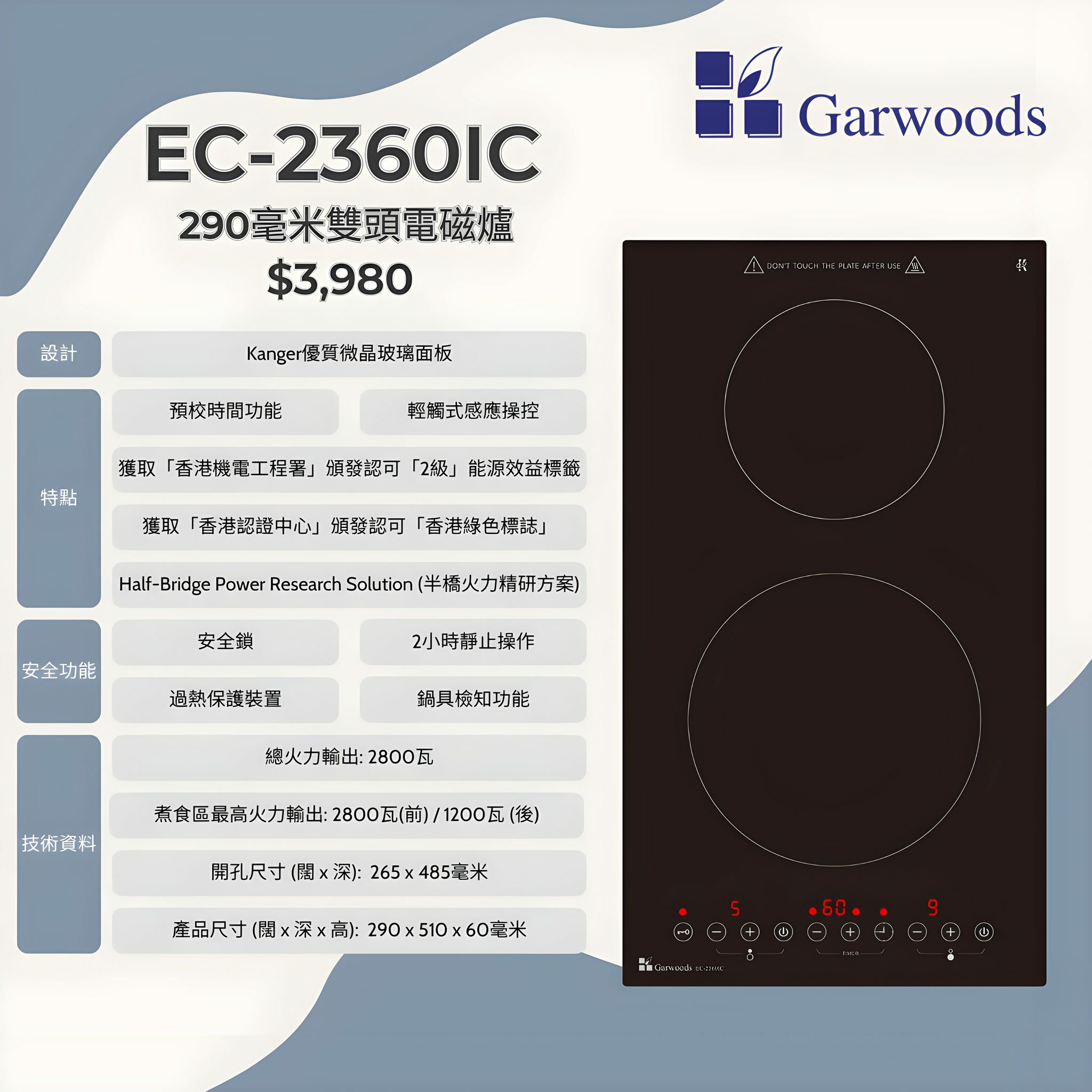 樂思 Garwoods EC-2360IC‧座檯‧嵌入式‧290mm 雙頭電磁爐‧2800W‧香港行貨,原廠2年保養‧