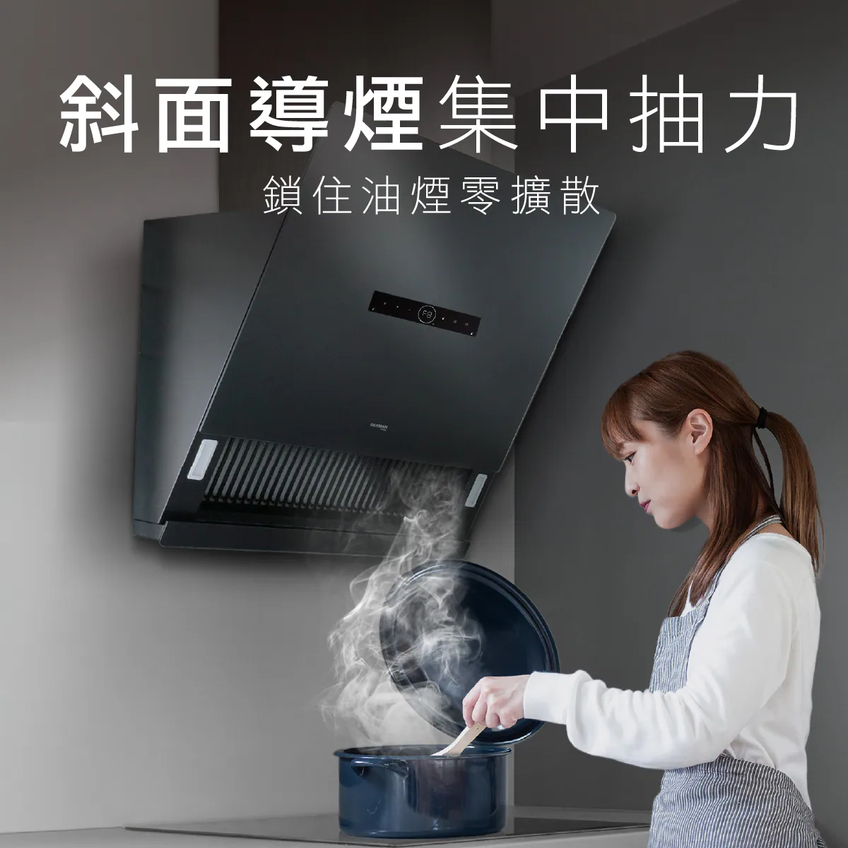 獨特斜面導煙設計,順應油煙自然上升路徑形成強勁渦流式負壓區域,集中抽力,全方位鎖住油煙味,並將外散四周的油煙蒸氣導向吸風口,更快更廣地吸入機內,即使猛火爆炒,廚房仍然清新舒適,頭髮衣服不沾油煙味。