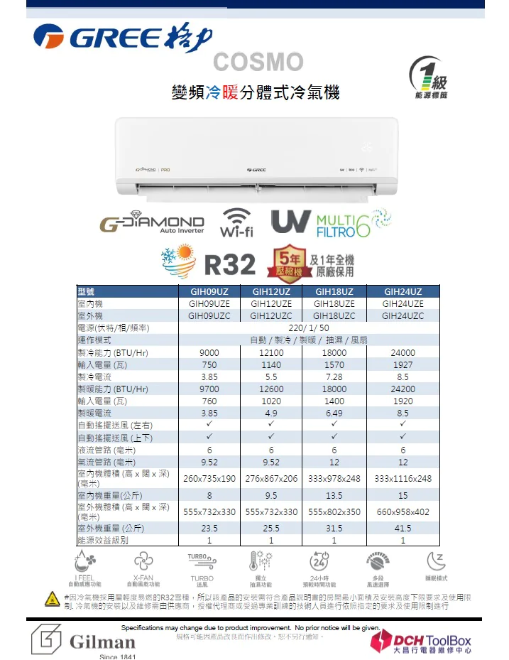 💥New💥 格力 Gree GIH12UZE/GIH12UZC‧1.5匹 R32 WIFI‧UV 變頻冷暖‧COSMO 分體式冷氣機‧香港行貨,原廠1年全機,5年壓縮機保養‧