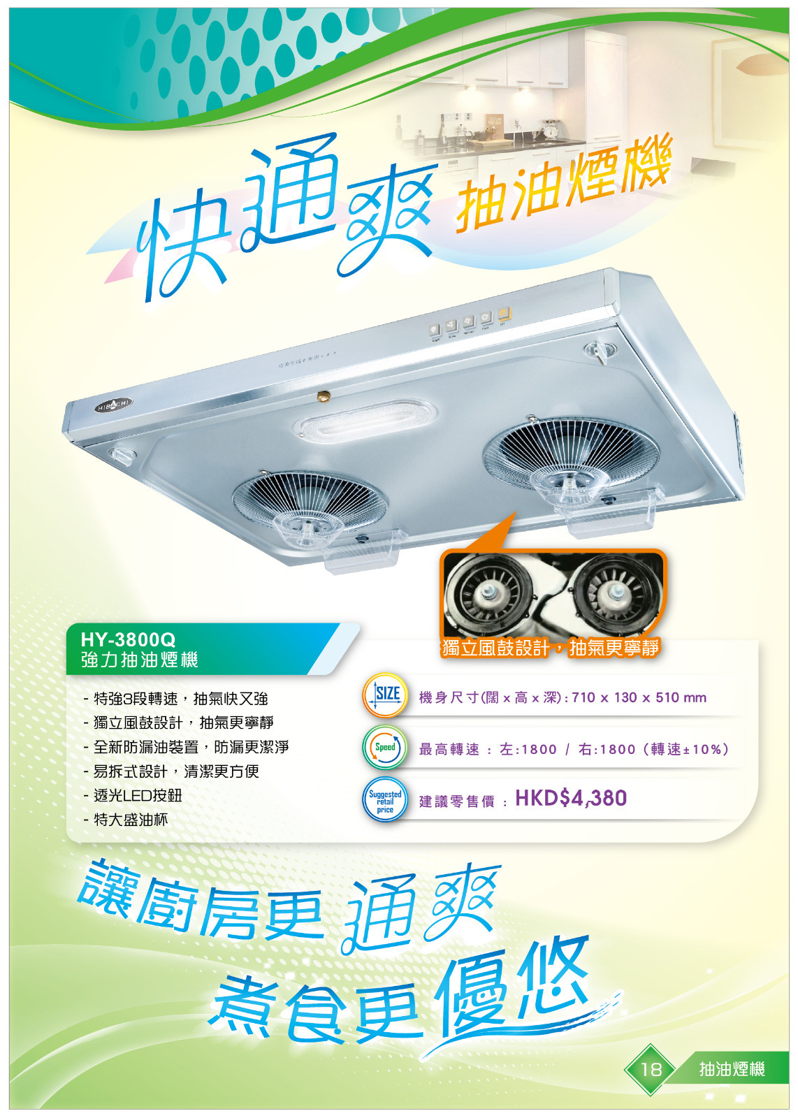 氣霸 Hibachi HY-3800Q‧710mm 按鈕易拆式抽油煙機‧獨立風鼓‧香港行貨,原廠1年保養‧