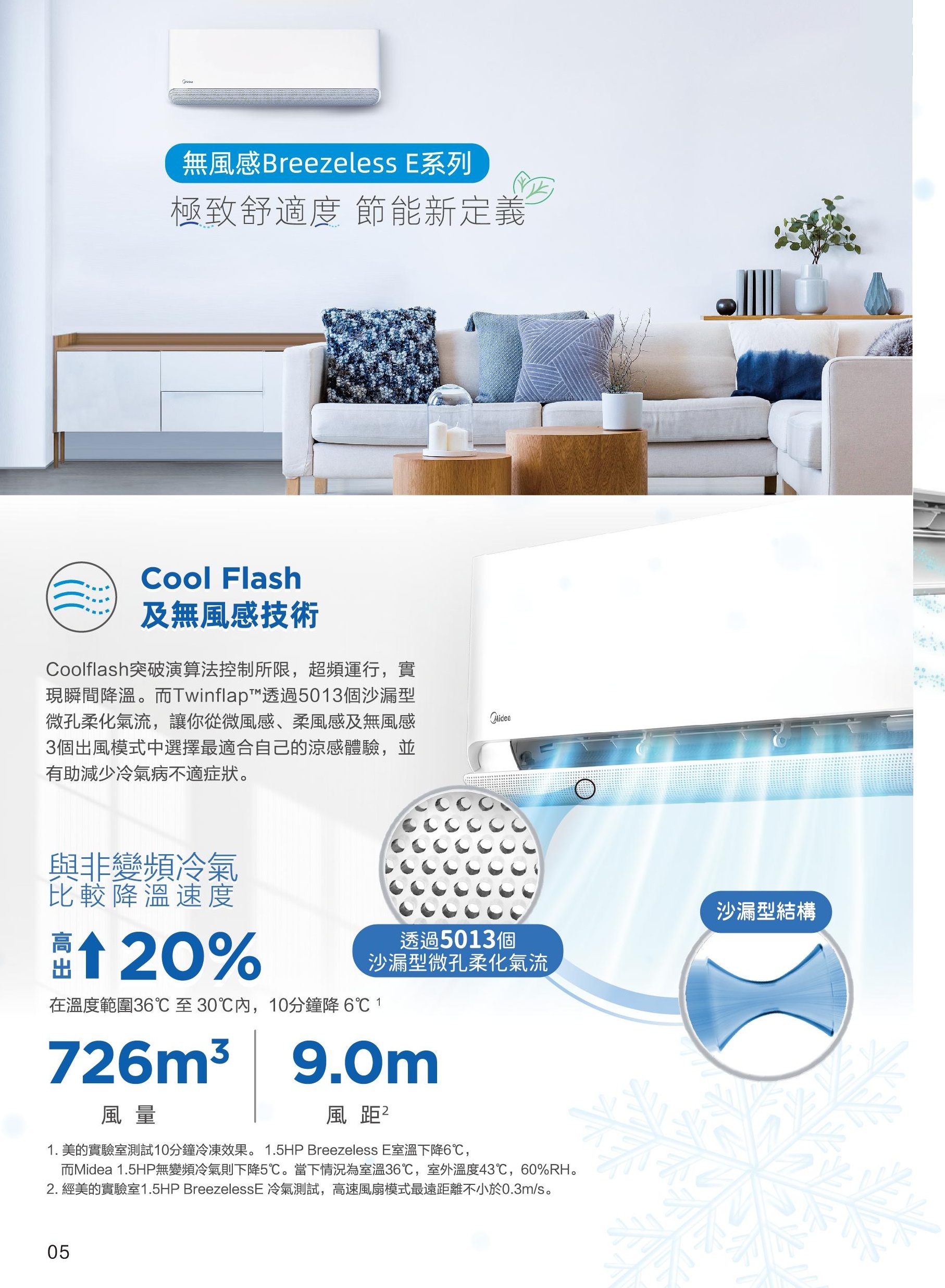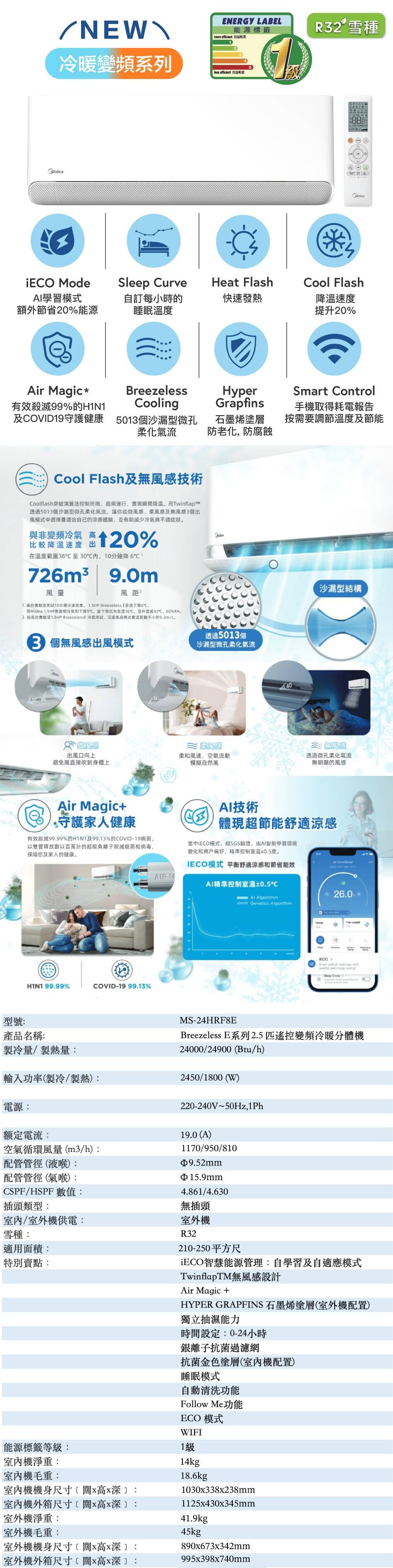 美的 Midea MS-24HRF8E/MS-24HRF8E‧2.5匹 R32 智能變頻冷暖‧Breezeless E分體式冷氣機‧香港行貨,原廠2年全機及5年壓縮機保養‧