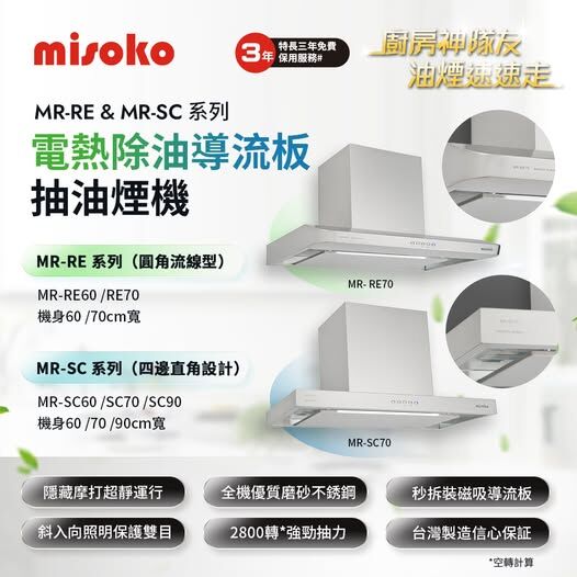 Misoko MR-RE60 60厘米 流線型圓角導流板抽油煙機是一款專為現代廚房設計的高效能家電。這款抽油煙機採用精選磨砂不銹鋼機身,結合流線型圓角導流板設計,不僅外觀時尚,更具備強勁的油煙吸排能力。其超薄機身厚度僅75.8毫米,有效節省廚房空間。配備DC12-9W LED省電照明,提供明亮視野。產地為台灣,並享有3年保用期,是您打造健康無煙廚房的理想選擇。