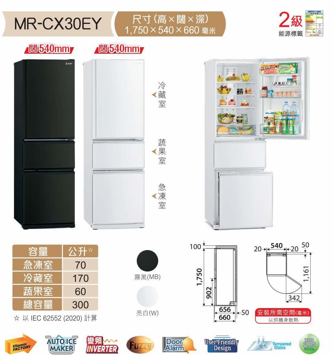 💥New💥 三菱電機 Mitsubishi Electric MR-CX30EY‧變頻三門雪櫃‧自動製冰‧300公升‧香港行貨,原廠5年全機,10年壓縮機保養‧