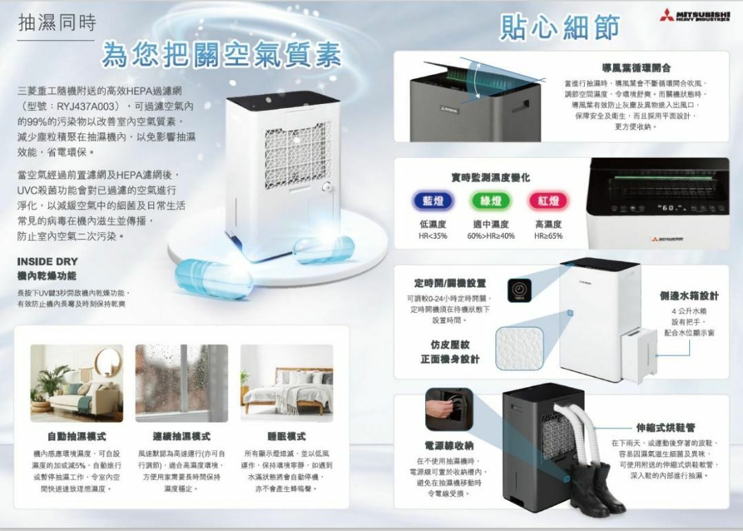 三菱重工 Mitsubishi Heavy MDC25W-H‧UVC+HEPA 空氣淨化多功能抽濕機‧伸縮乾鞋管‧26公升/日‧香港行貨,原廠1年保養‧