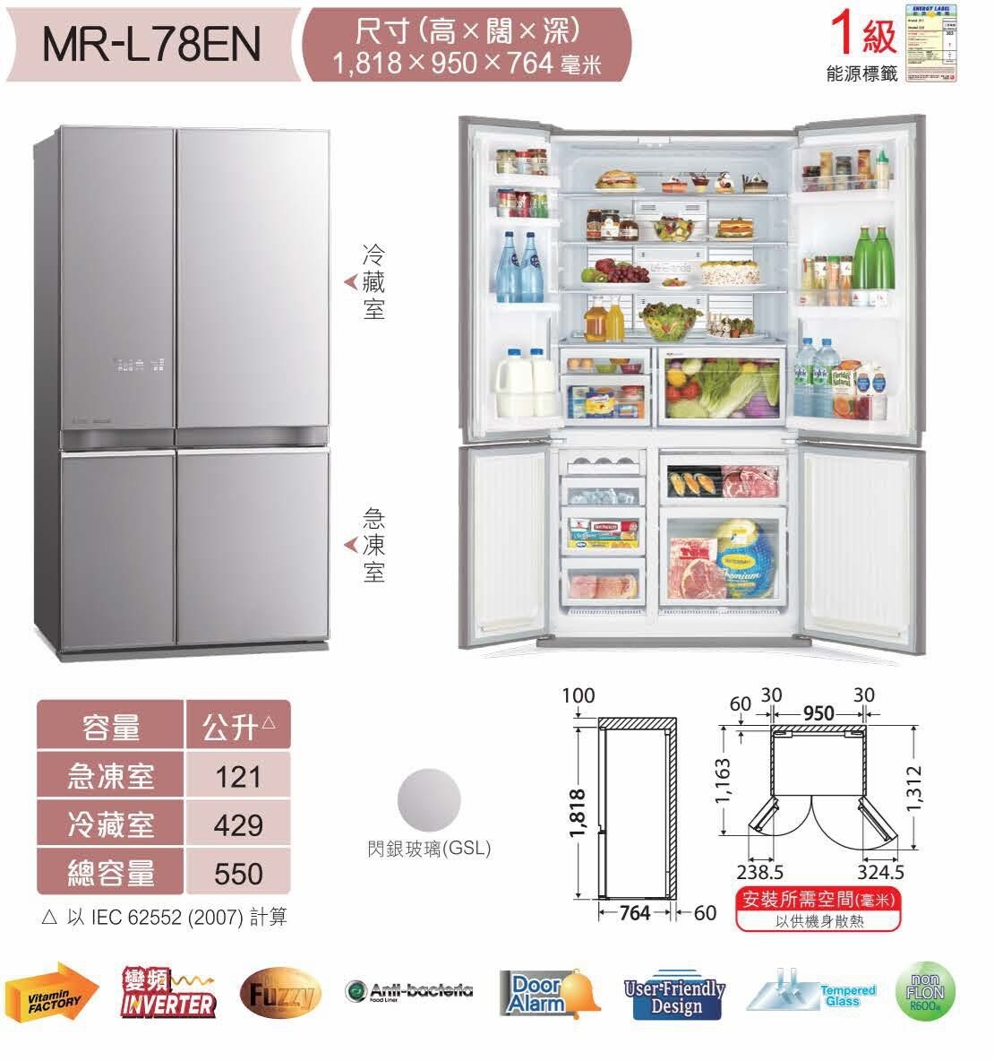 Mitsubishi Electric MR-L78EN‧4-Door Inverter Compressor Refrigerator‧550L‧Made in Tailand‧5-year limited warranty,Compressor10-years limited warranty‧